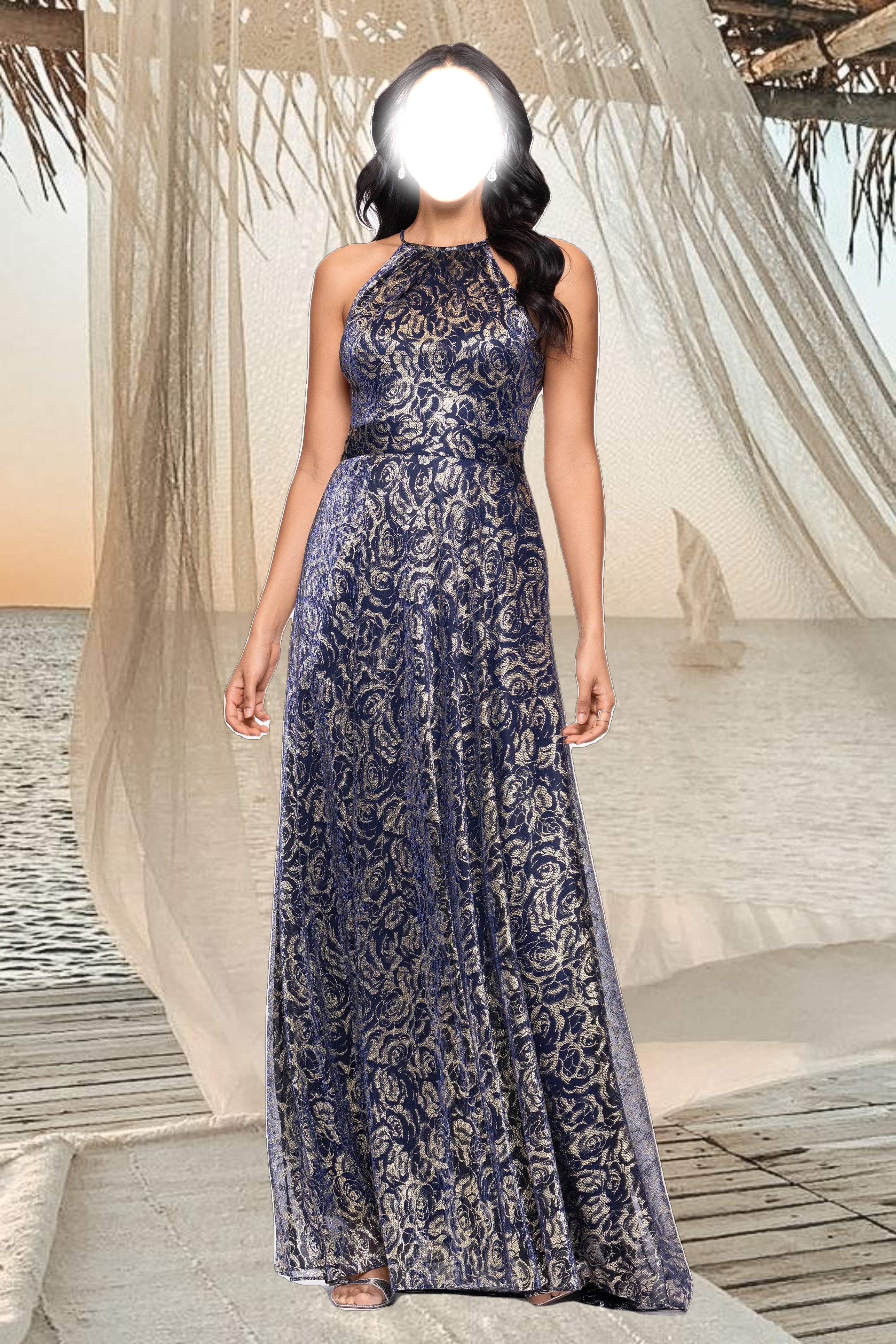 "Shelley" Metallic Foil Halter Neck Floor Length Dress