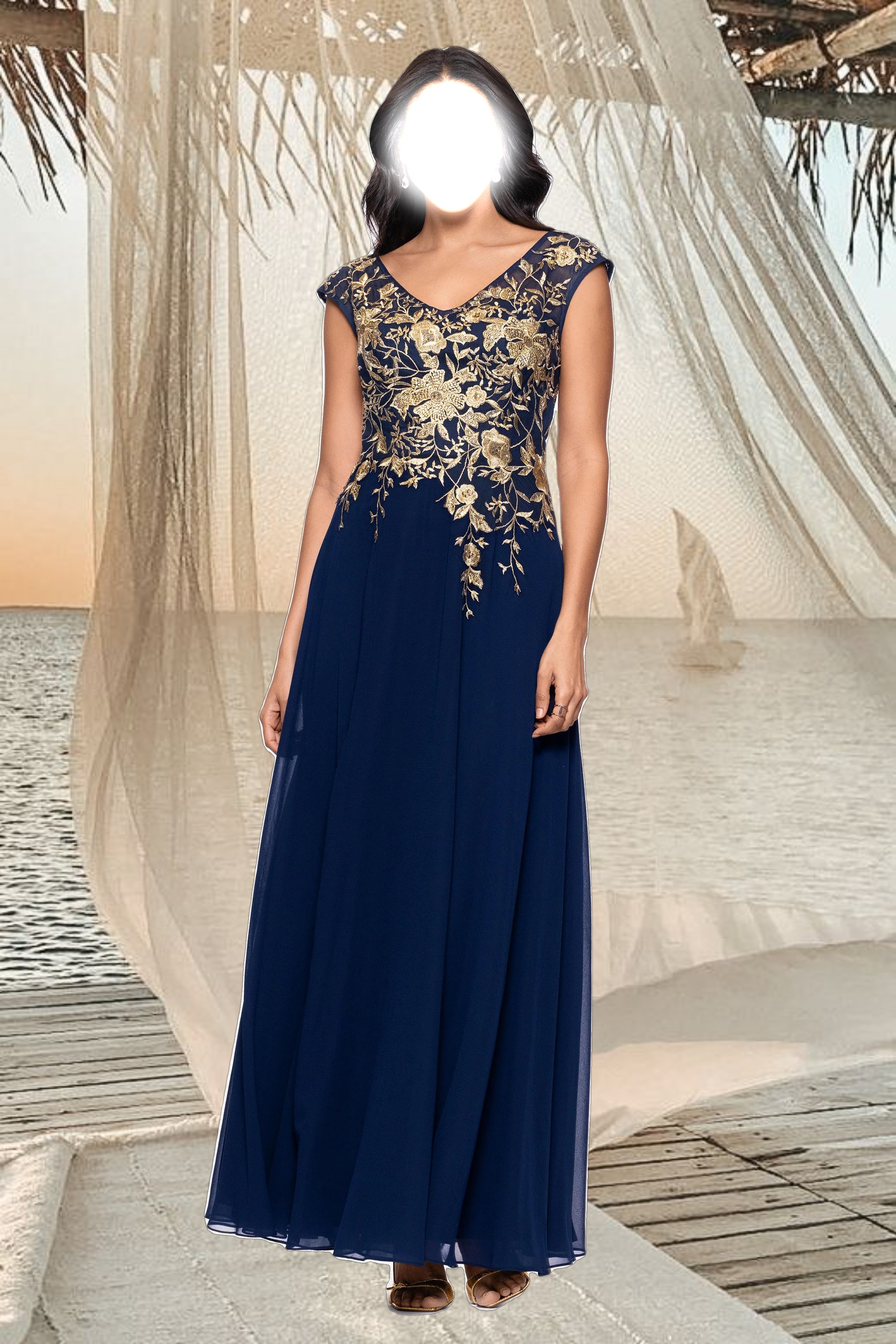 "Maeve" Chiffon Embroidered Bodice Floor Length Dress
