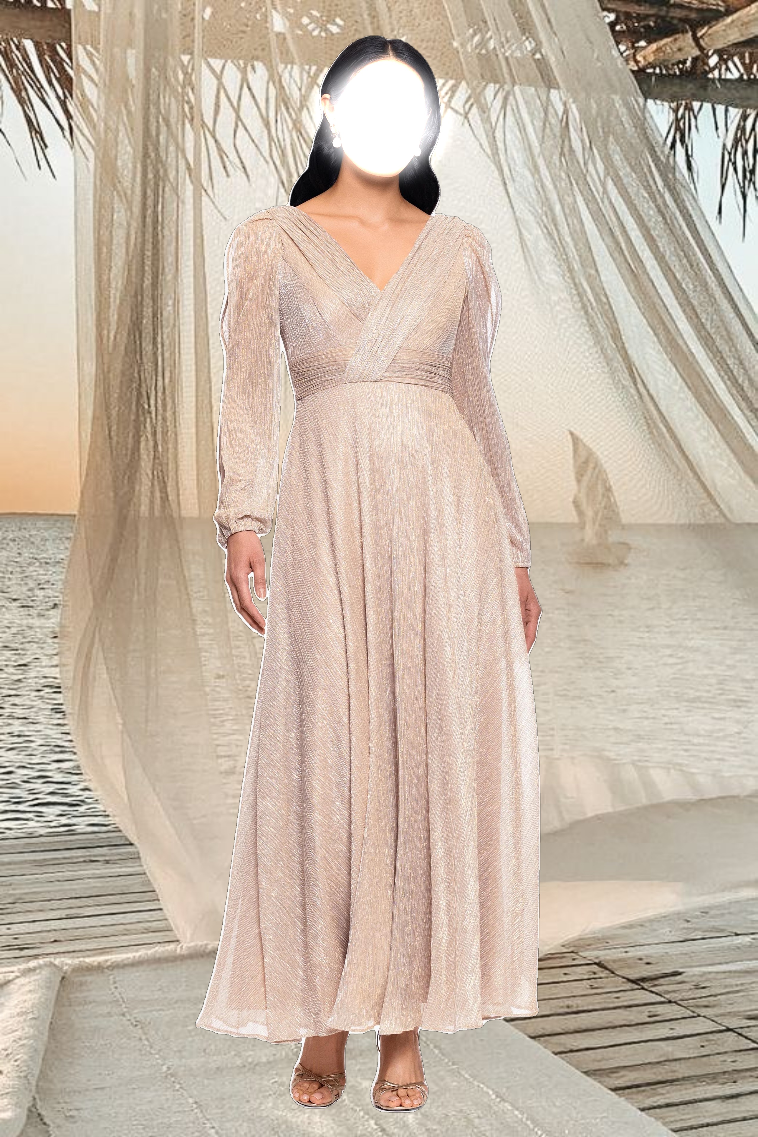 "Cheryl" Long Sleeve V Neck Metallic Knit Floor Length Dress