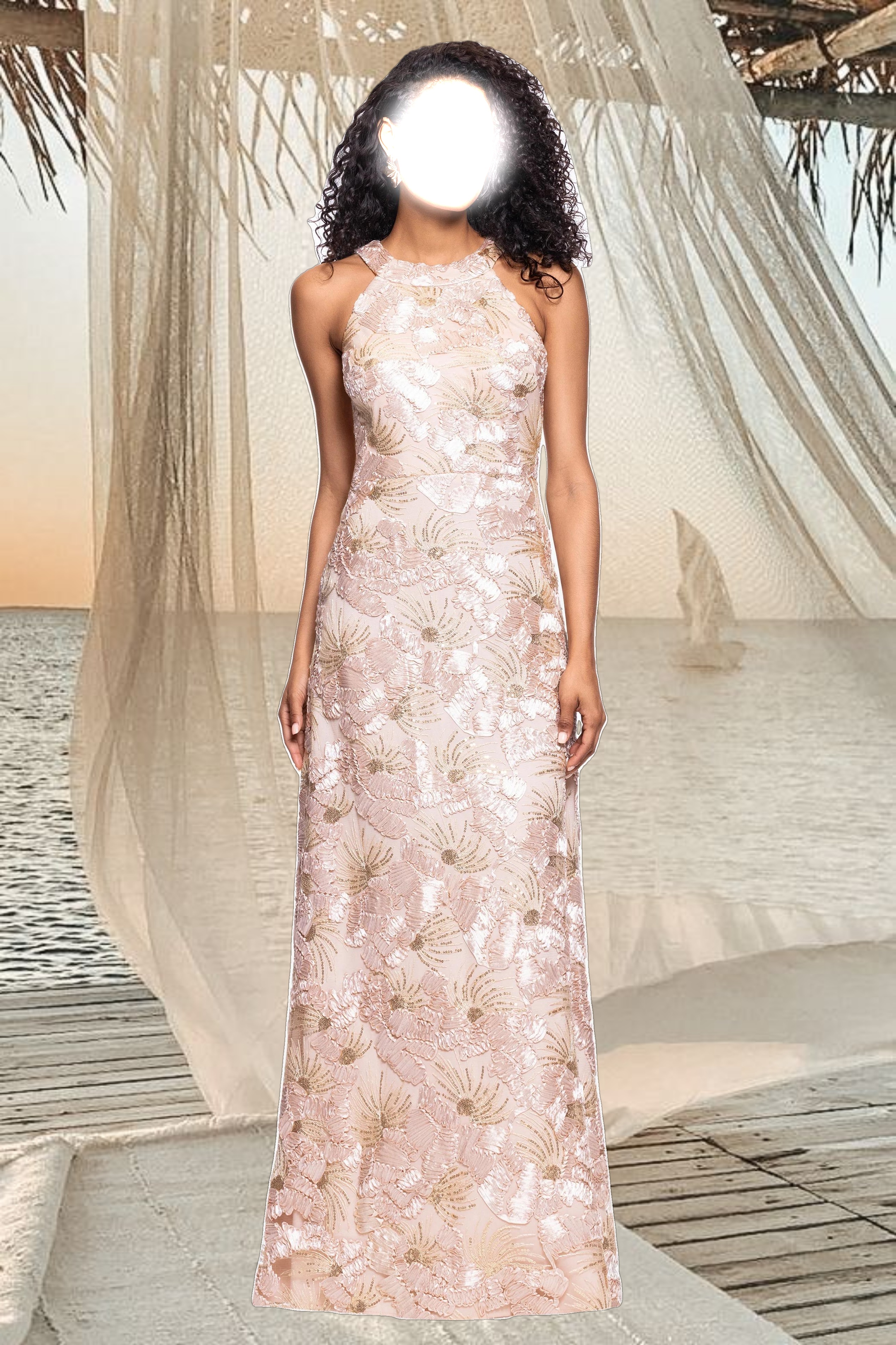 Petite "Fabiana" Halter Neck Soutache and Sequin Floor Length Dress
