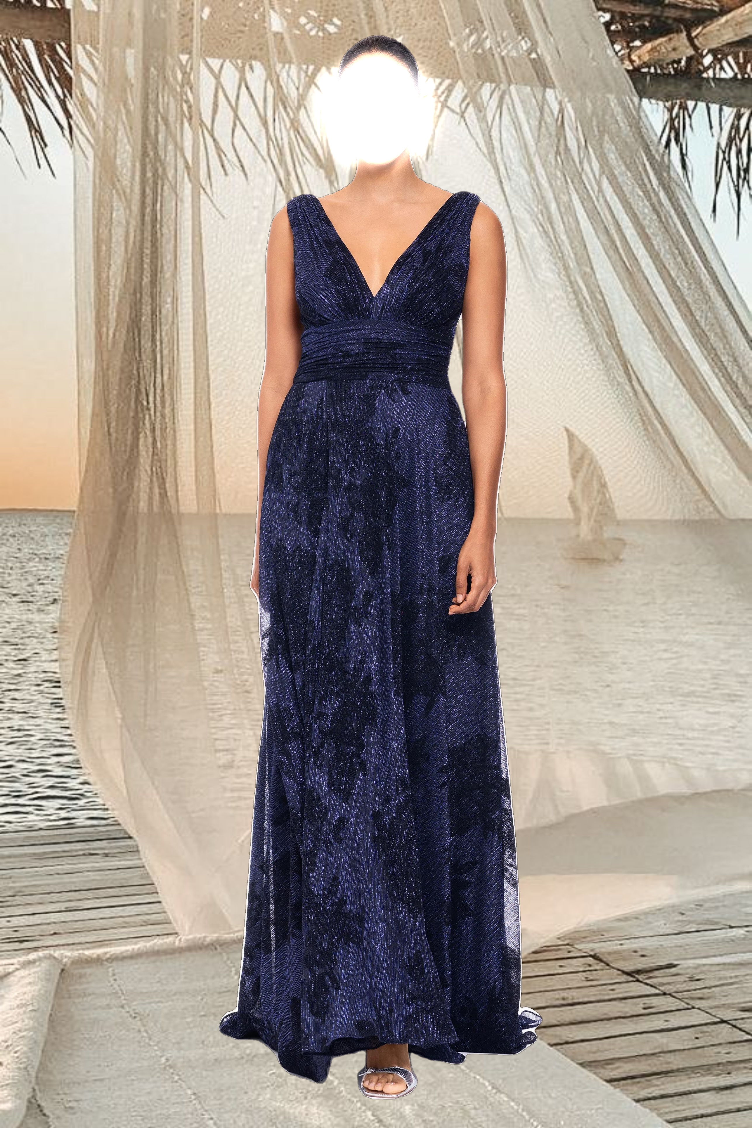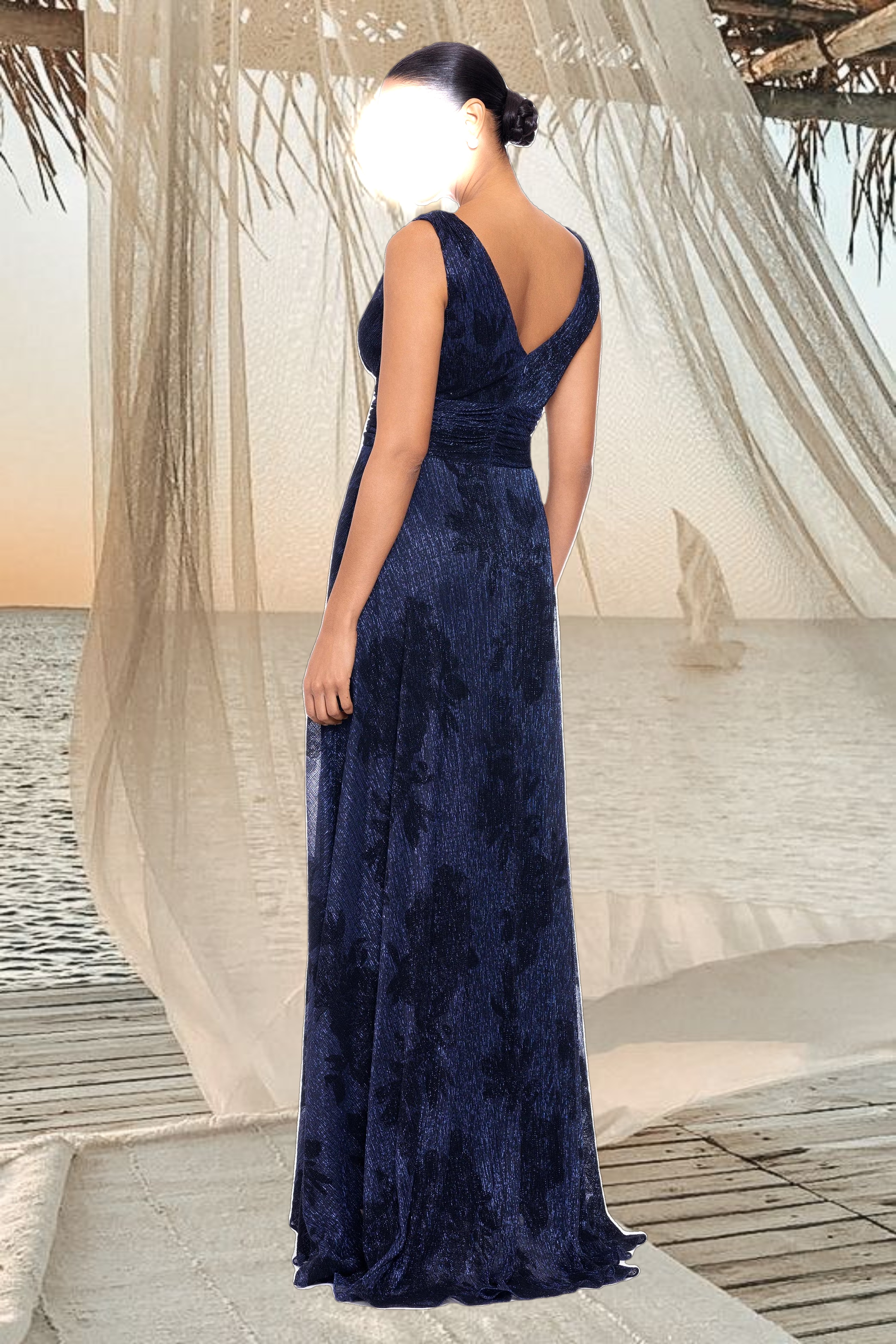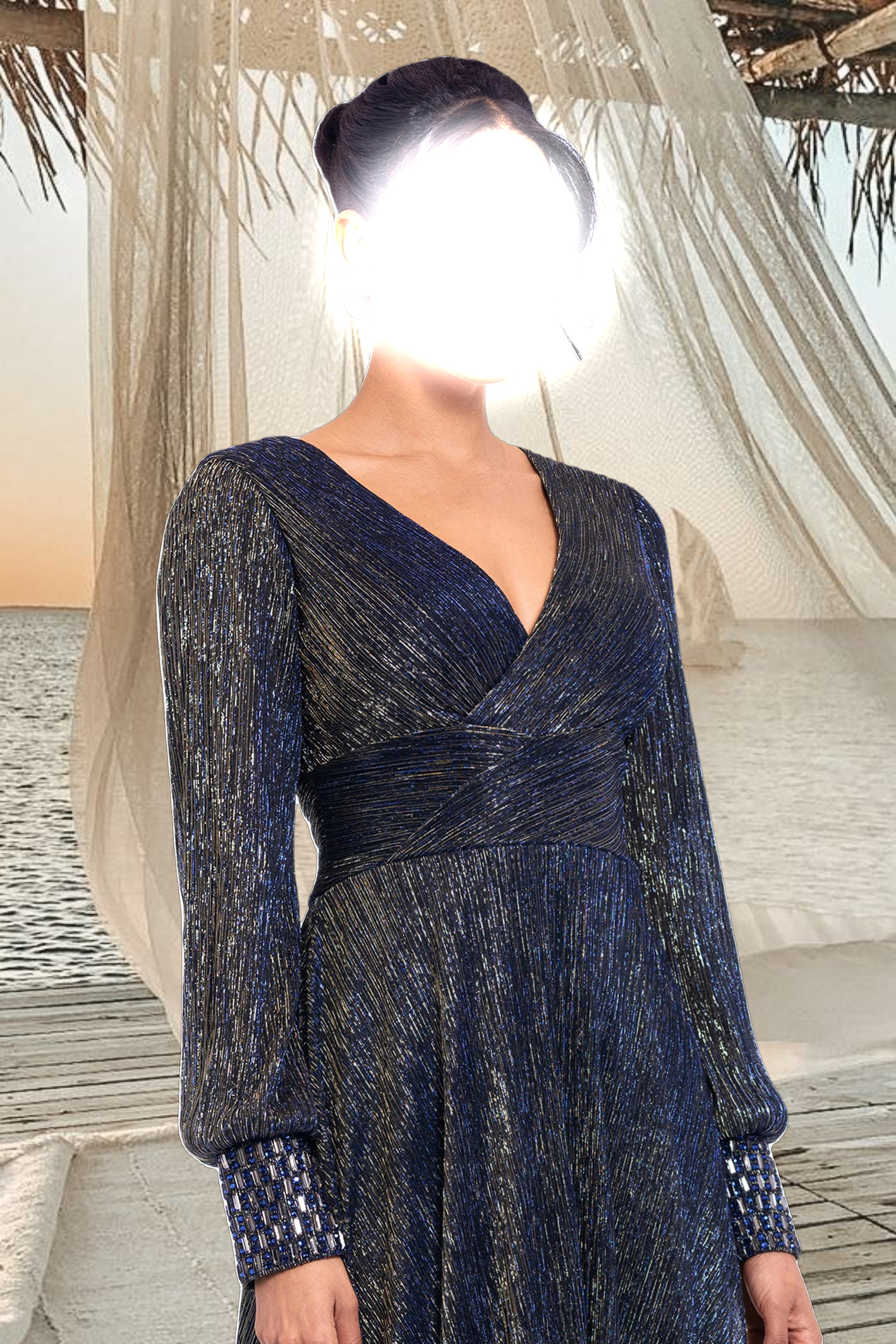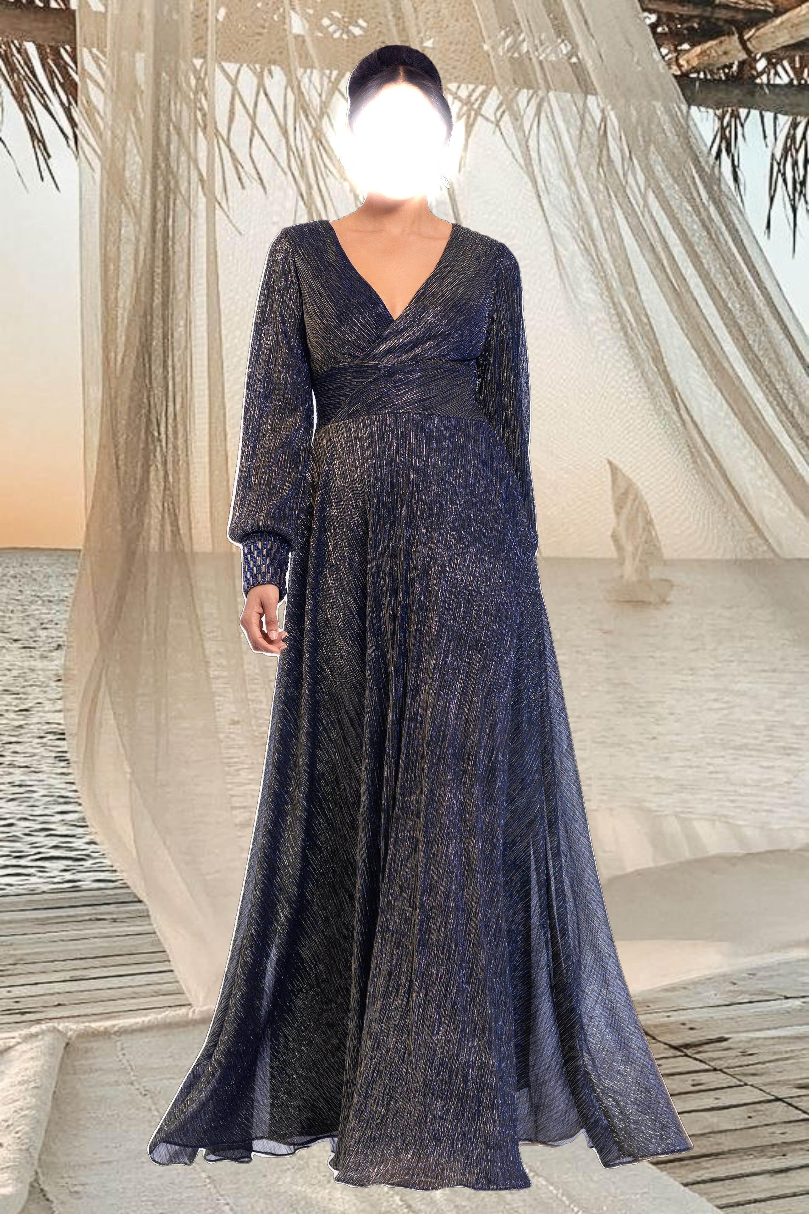 "Clarise" Long Sleeve Galaxy Pleated Foil Gown