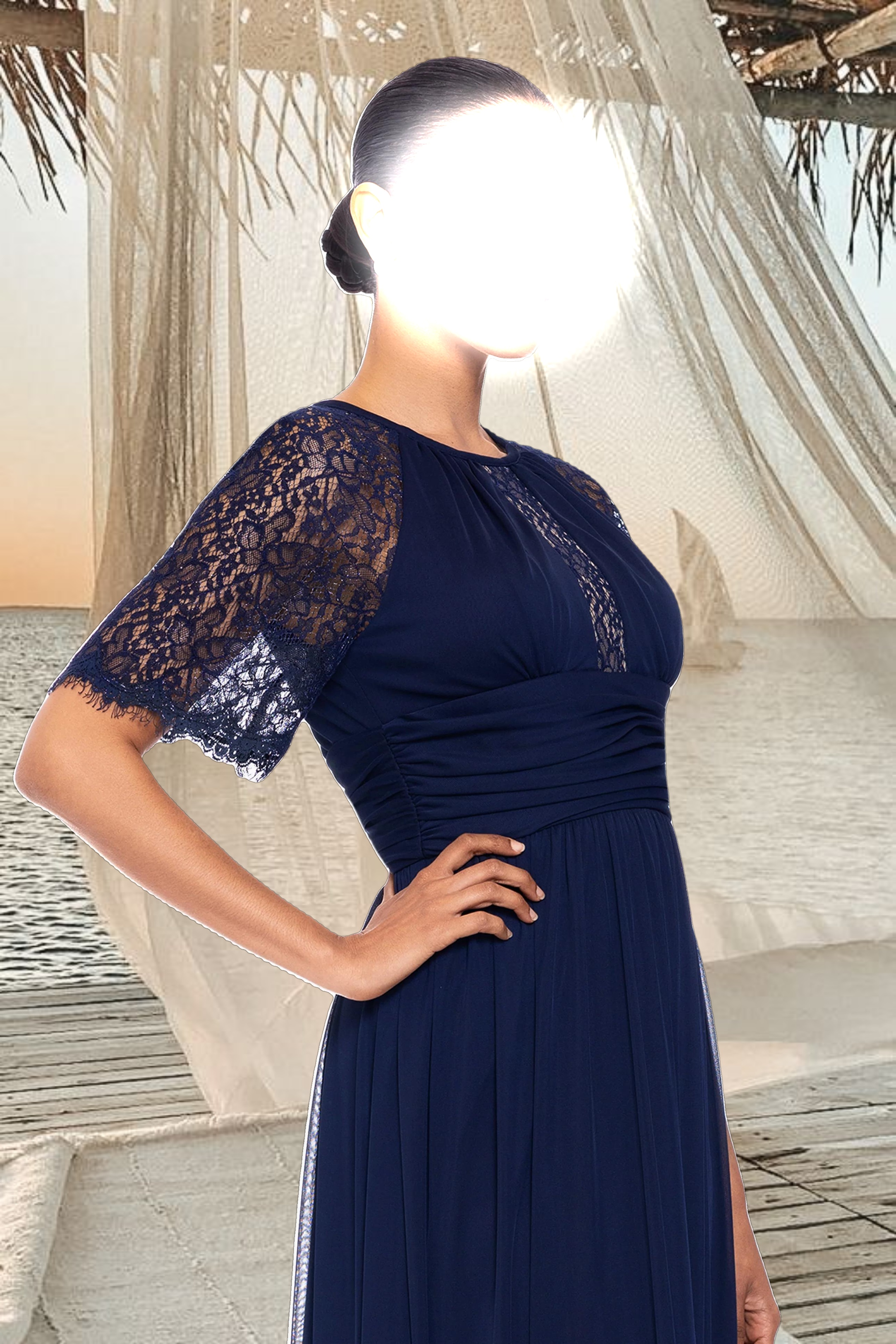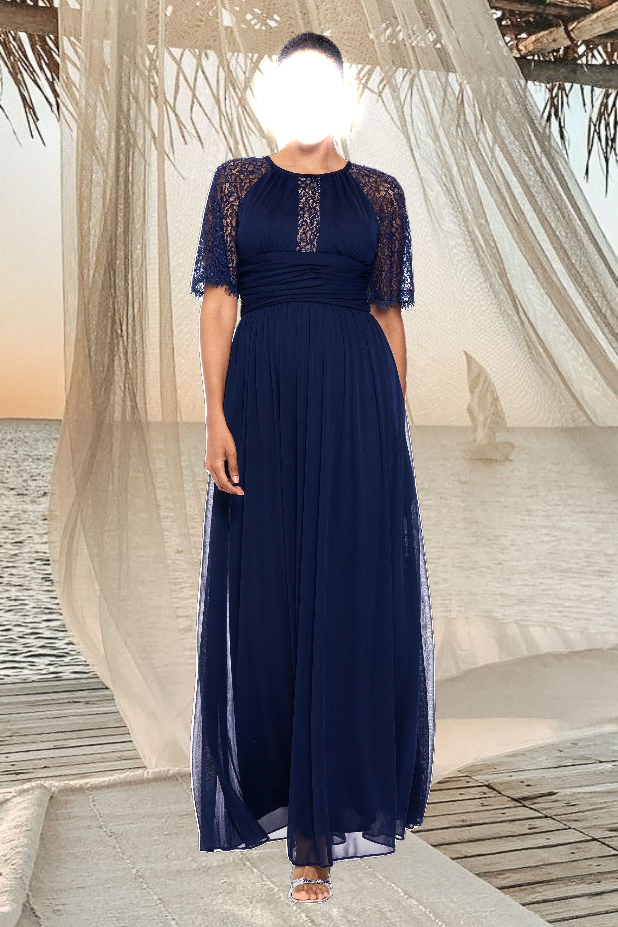 "Chrissy" Long Sheer Matte Jersey and Lace Sleeve Dress