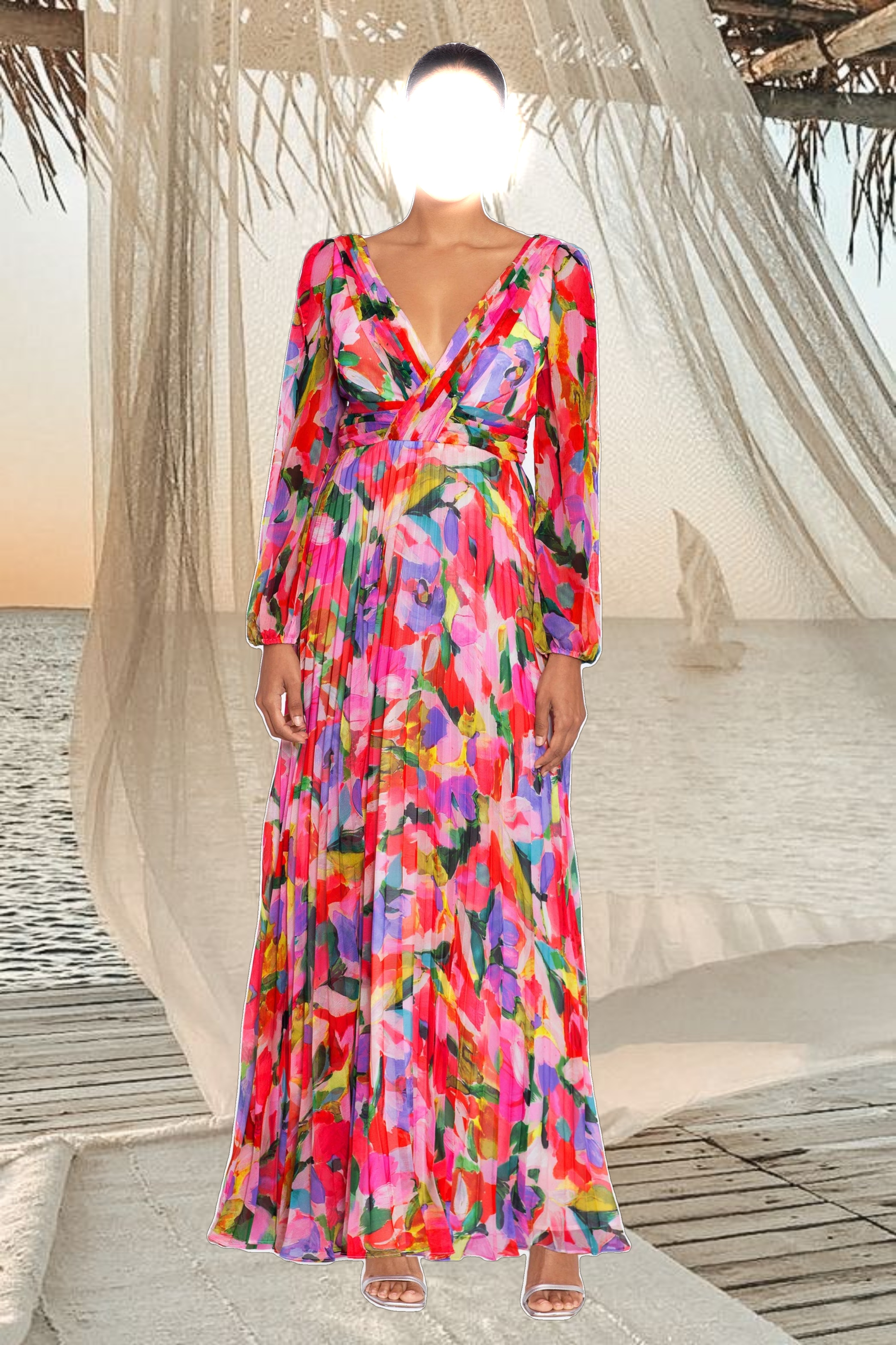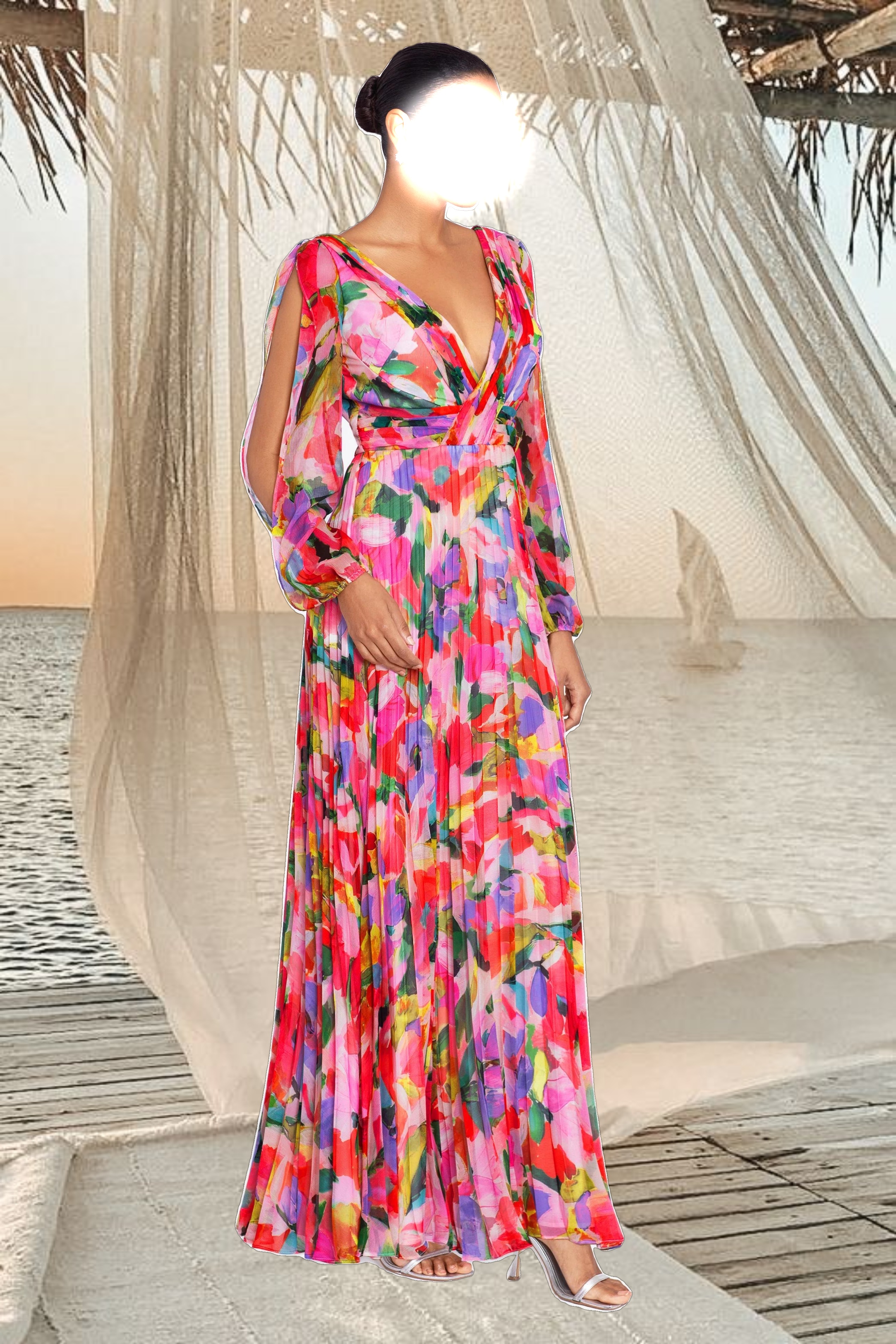 "Amber" Long Sleeve Chiffon Print Floor Length Dress