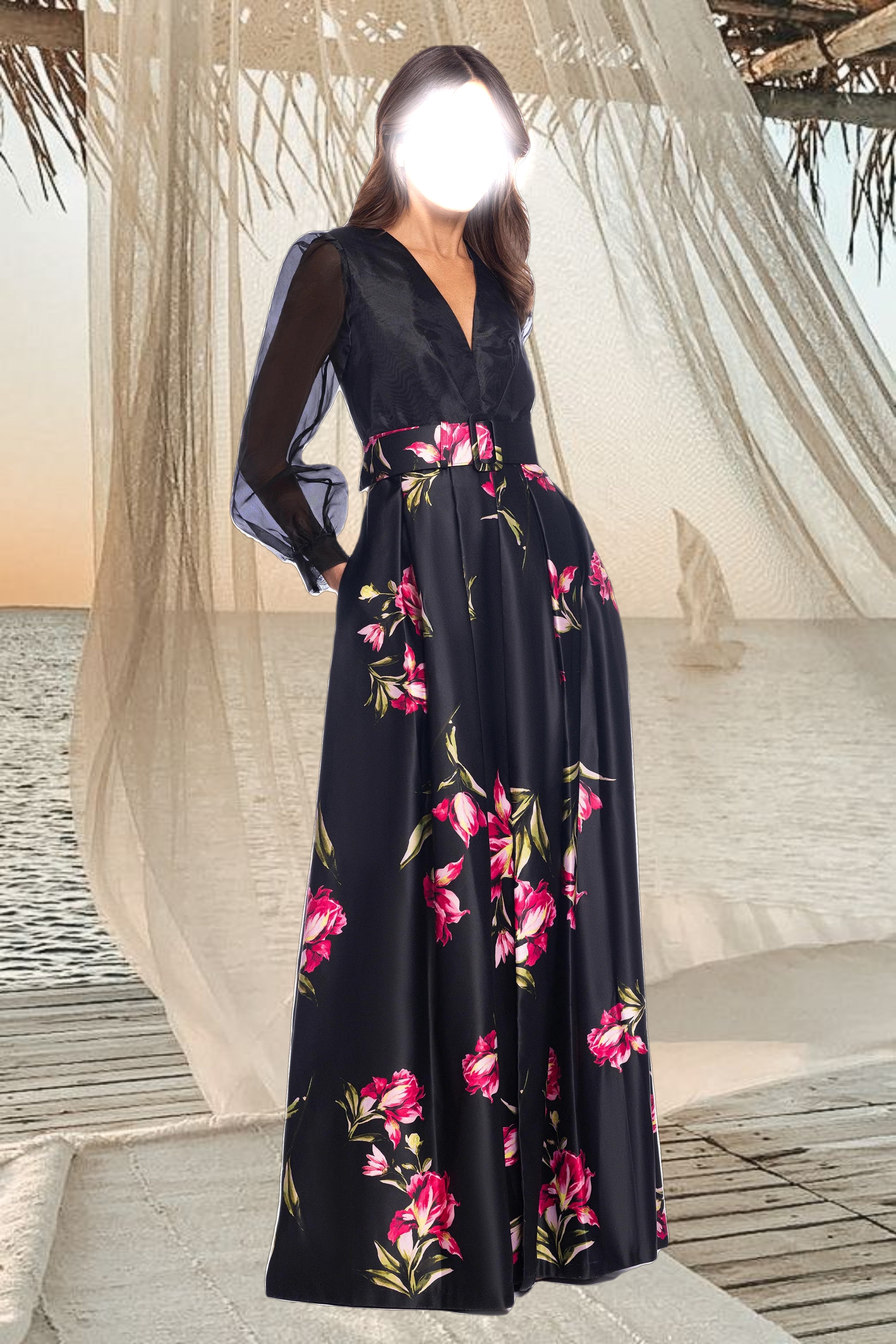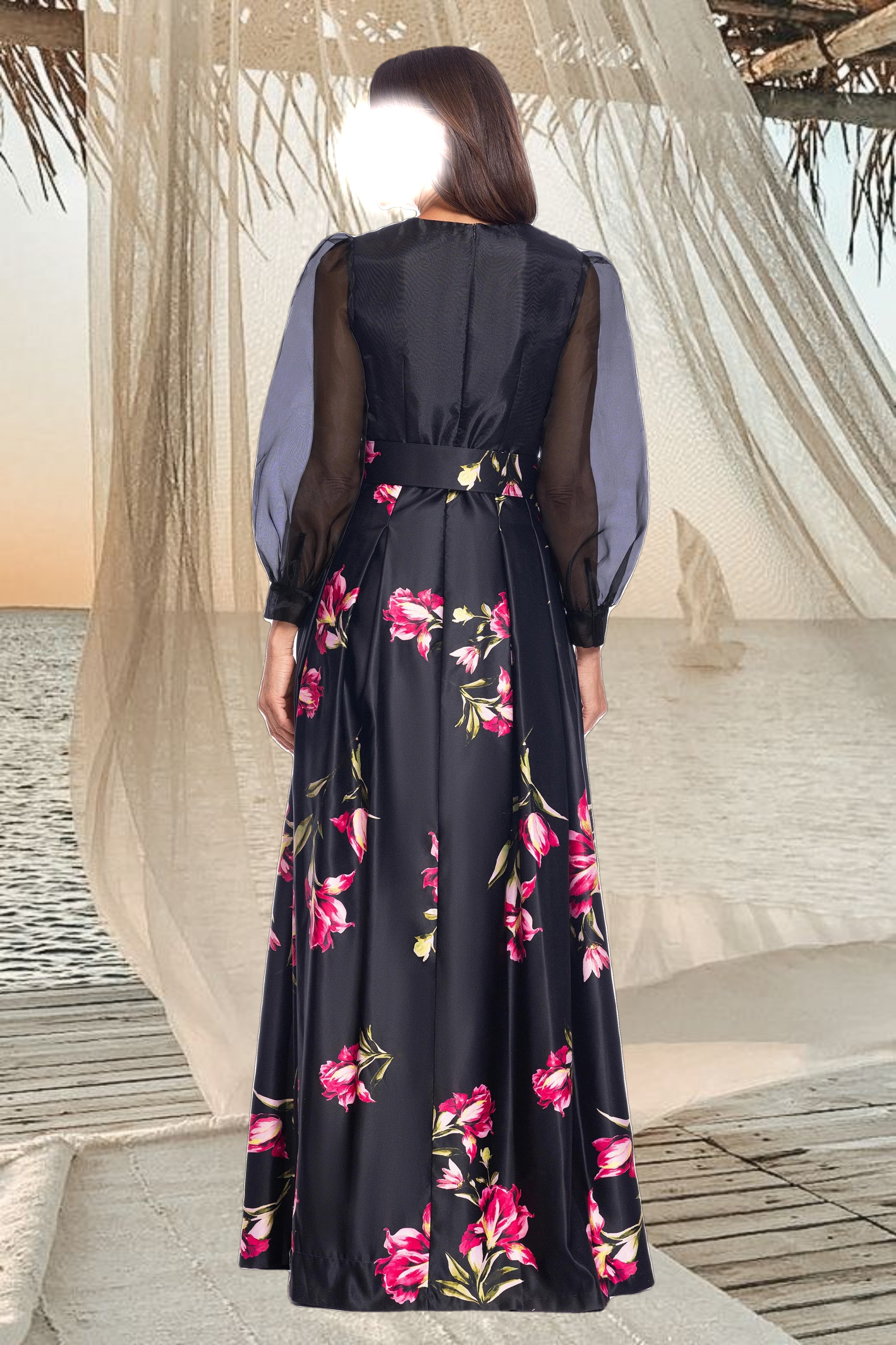 This elegant gown combines modern and classic elements. The deep V-neckline and sheer puffed sleeves add a sophisticated touch to the fitted bodice, while the full satin skirt, adorned with vibrant floral prints, brings a bold, feminine flair. Perfect for galas, weddings, or any formal occasion where you want to make a statement.