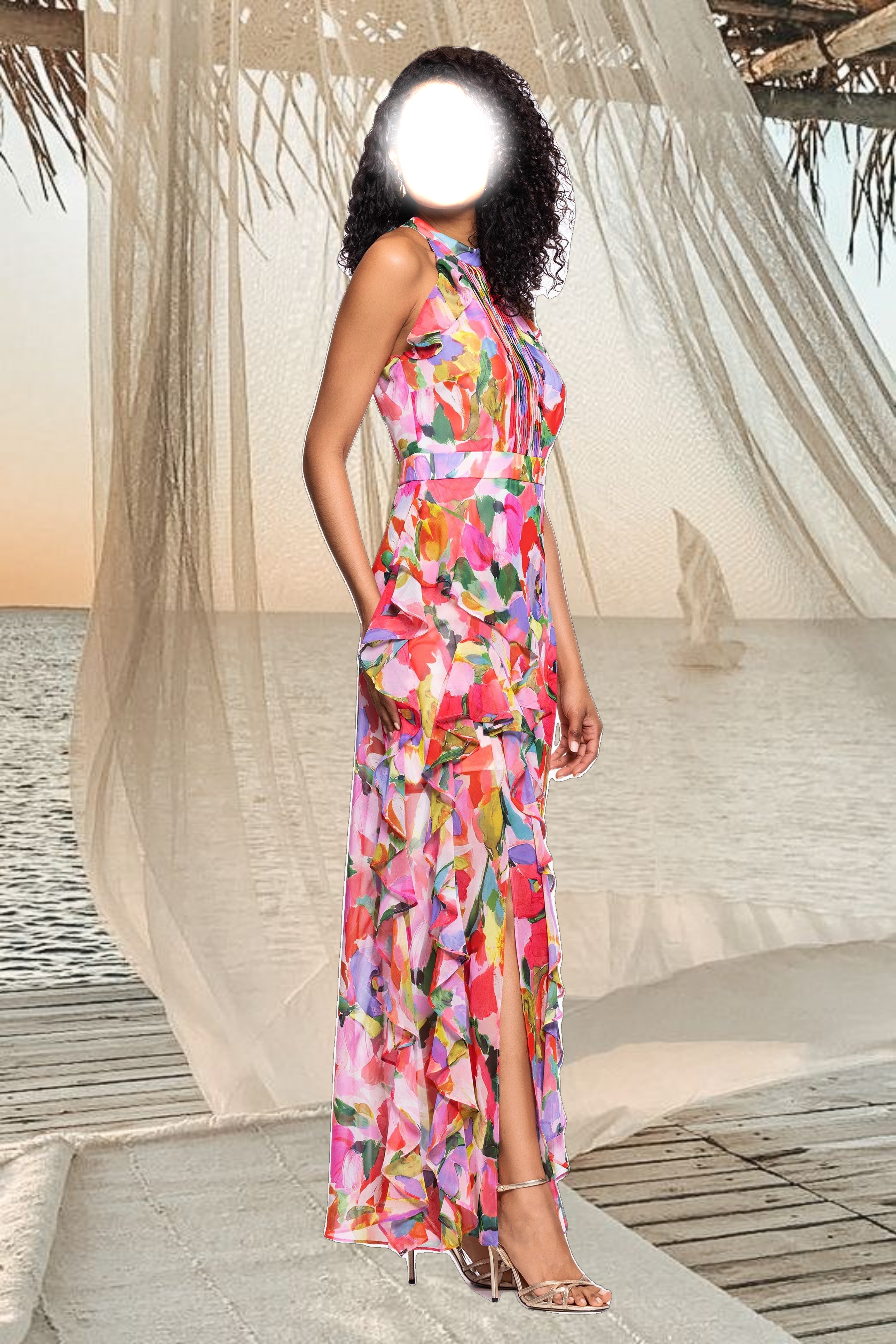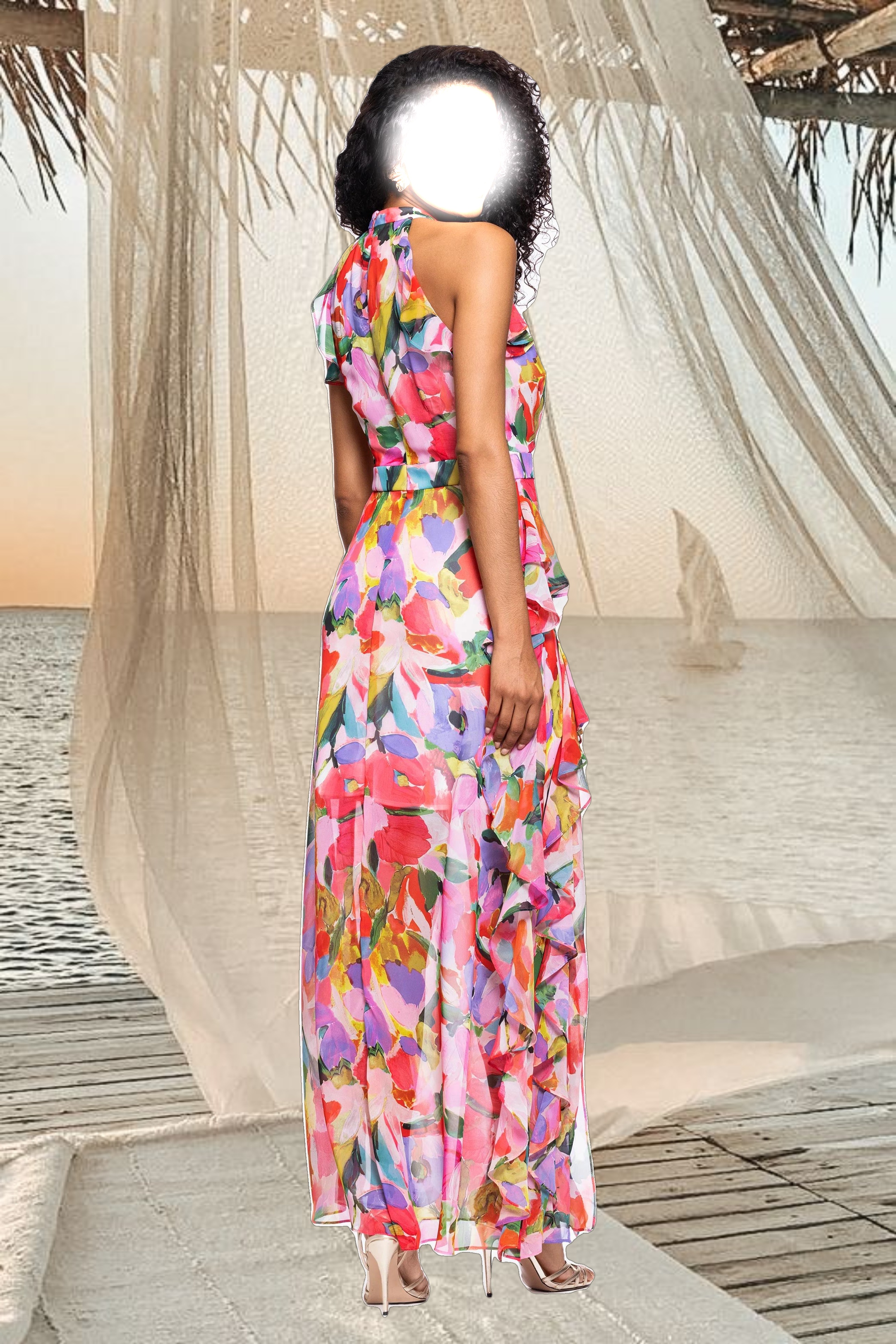 Turn heads in this halter-style maxi dress, featuring playful ruffle details and a flattering tiered design. Perfect for outdoor celebrations, garden parties, or festive events, it effortlessly blends charm and elegance for a standout look.