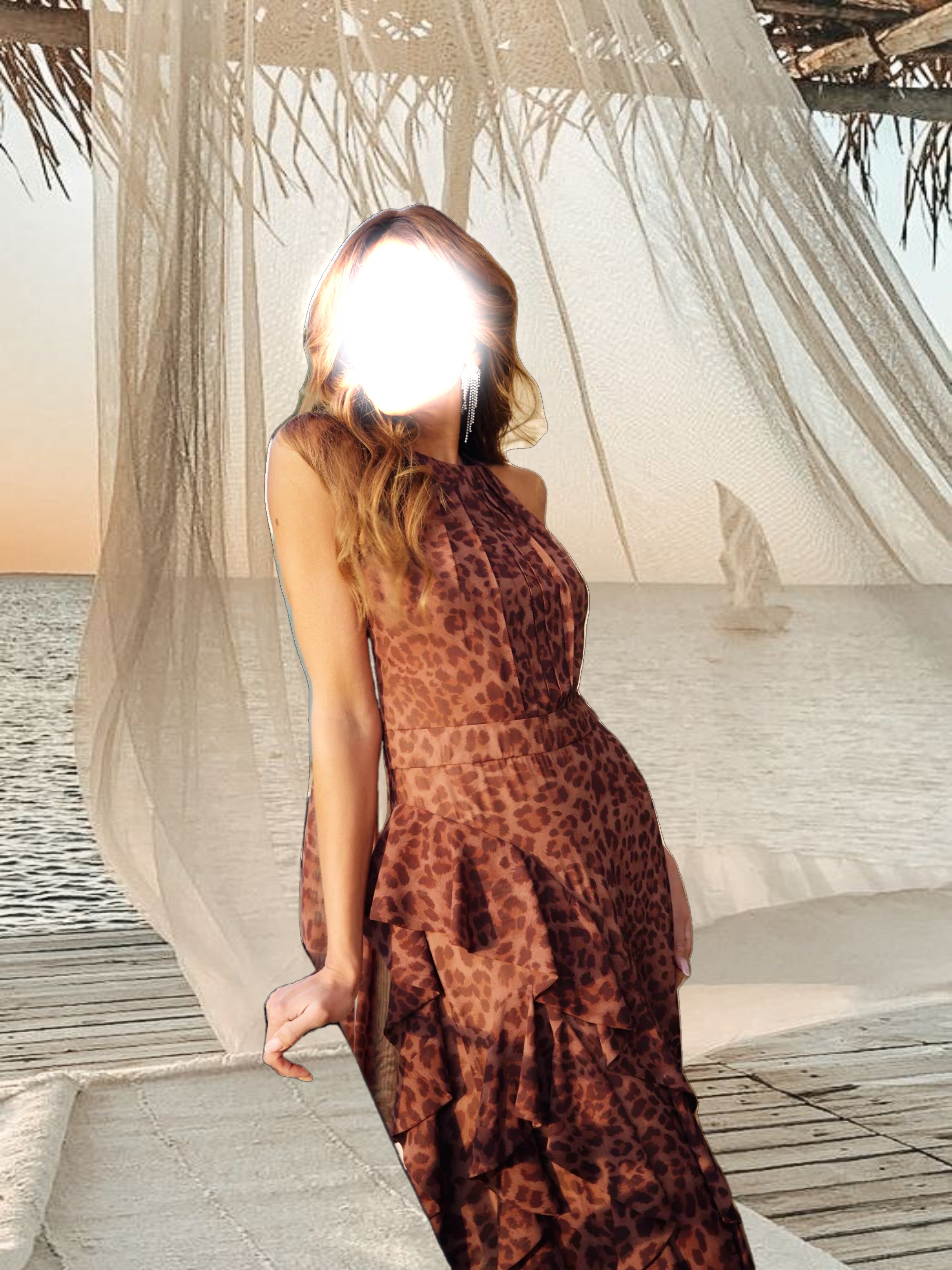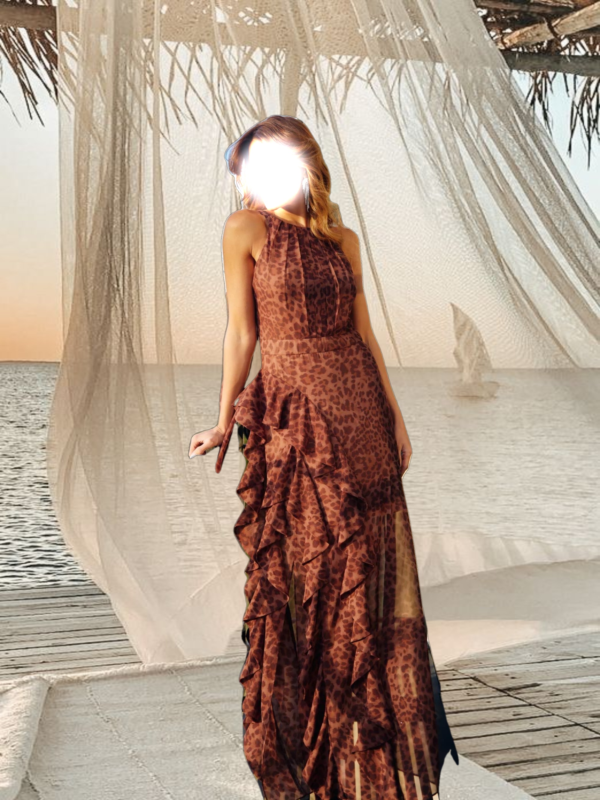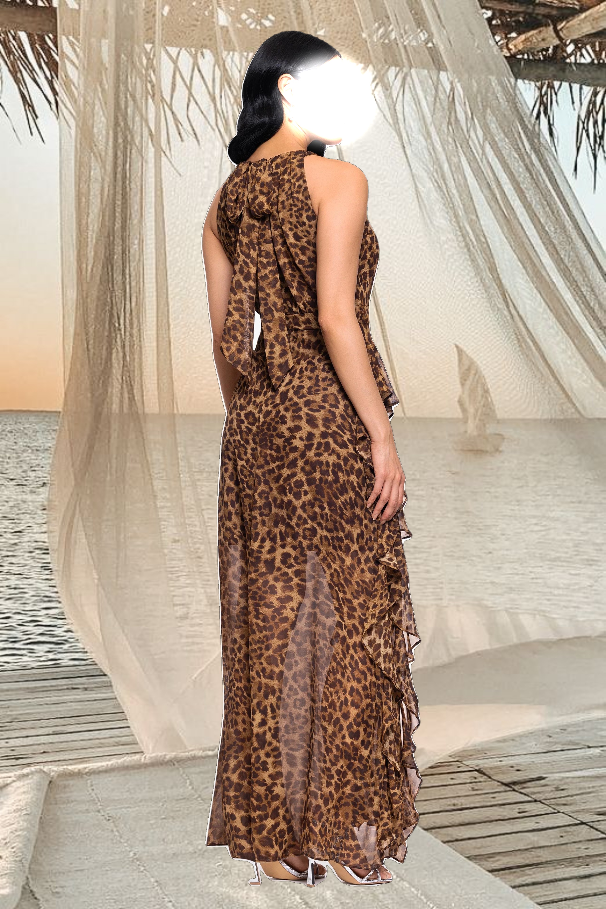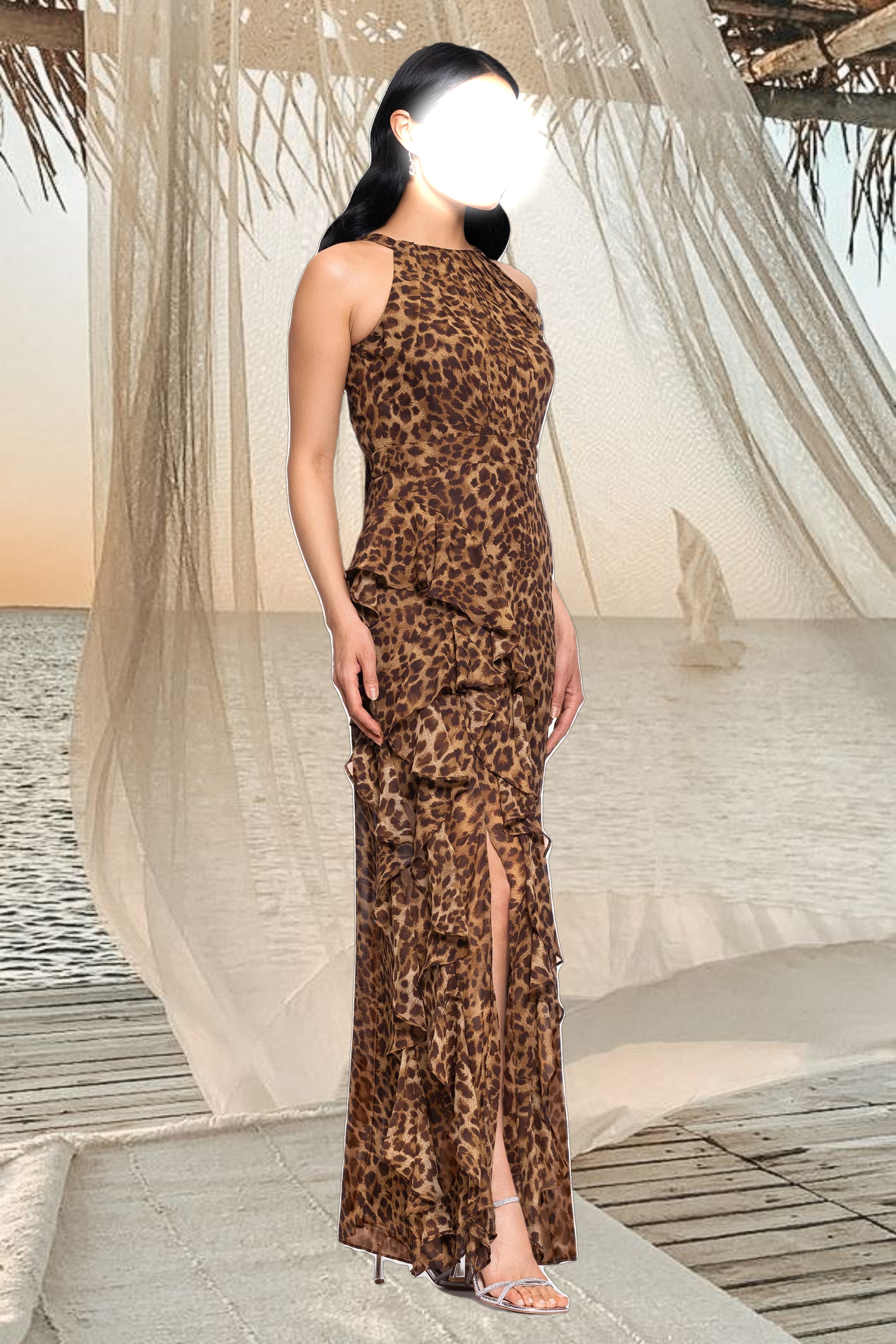 Unleash your wild side in this flowy animal print gown. A halter neckline and cascading ruffle add movement and drama, while the lightweight fabric keeps things breezy and bold. A fierce pick for weddings, vacations, or nights out.