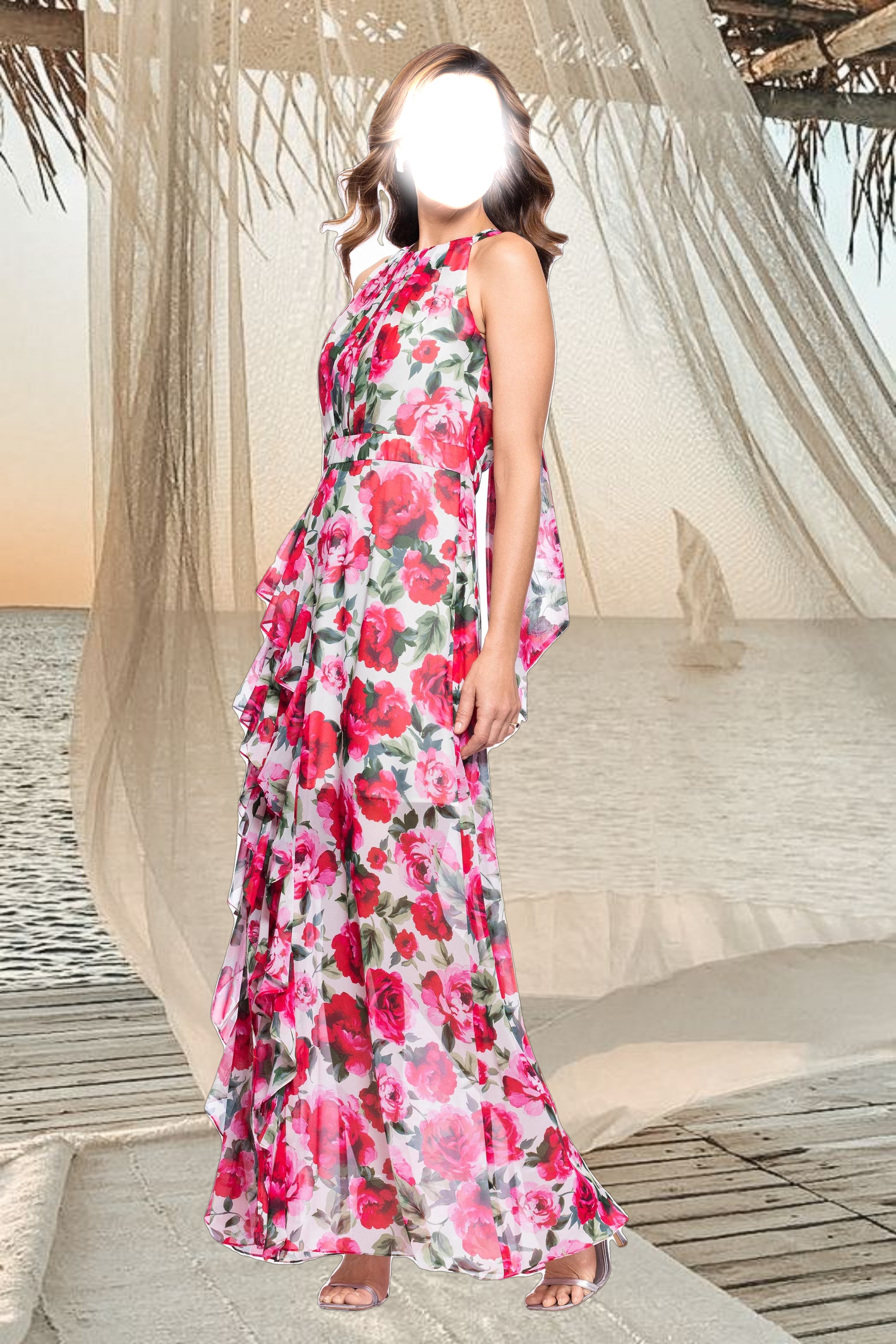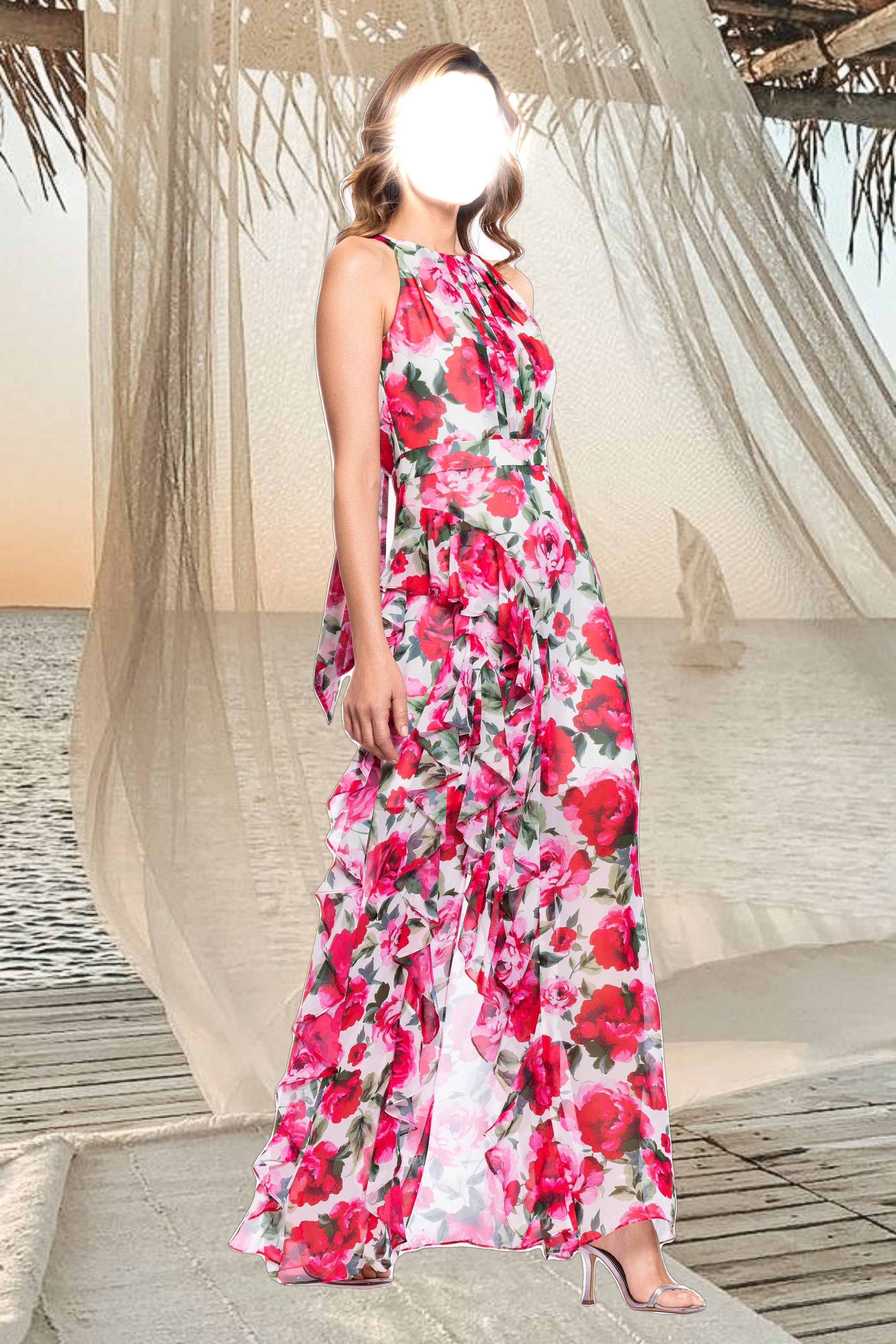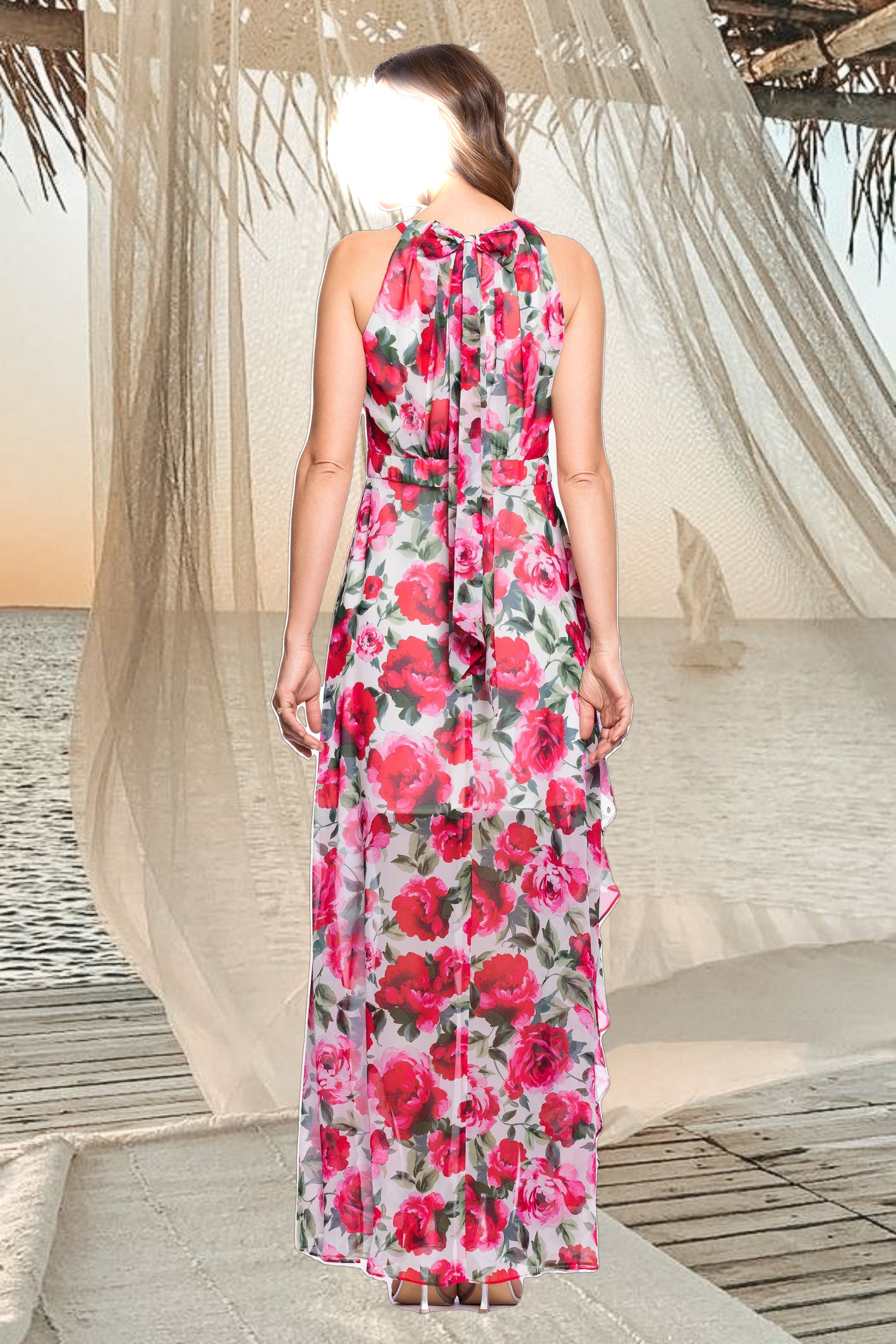 This stunning floral gown features a flattering halter neckline and a flowy, ruffled skirt, creating a feminine and romantic look. The bold, vibrant print in shades of red and pink makes it perfect for spring or summer events, like garden parties or weddings. With its light, airy fabric and playful design, this dress combines elegance with effortless charm.