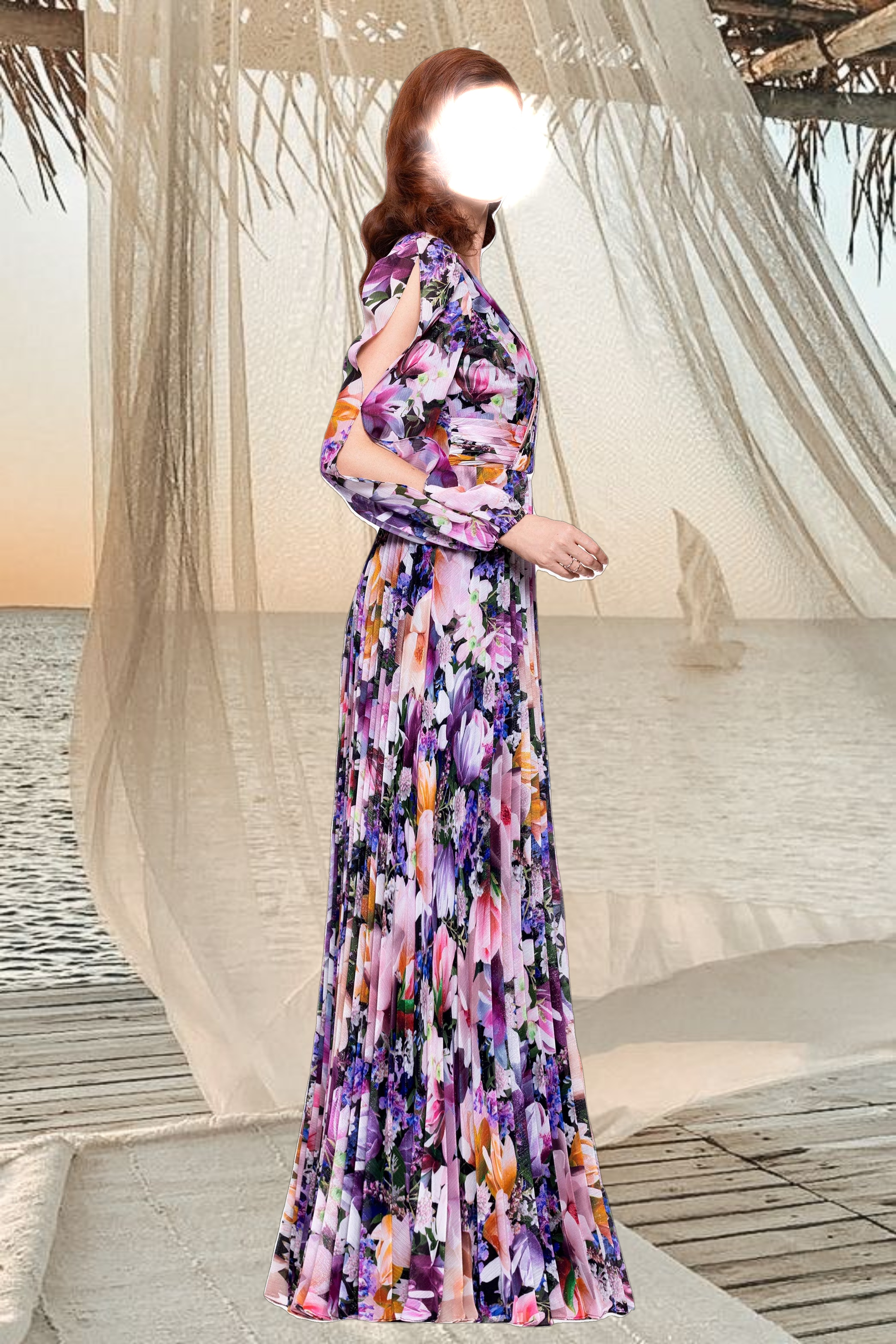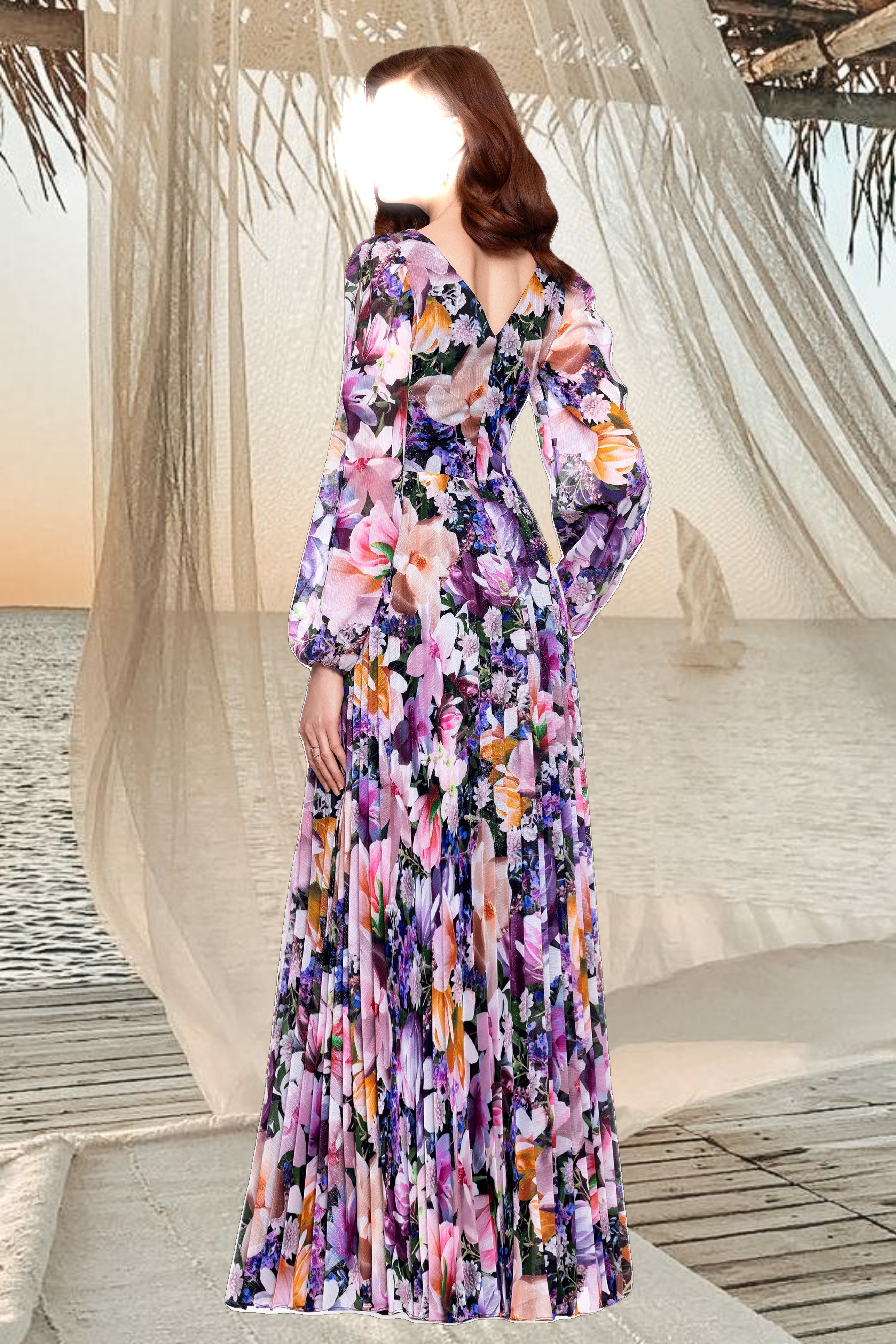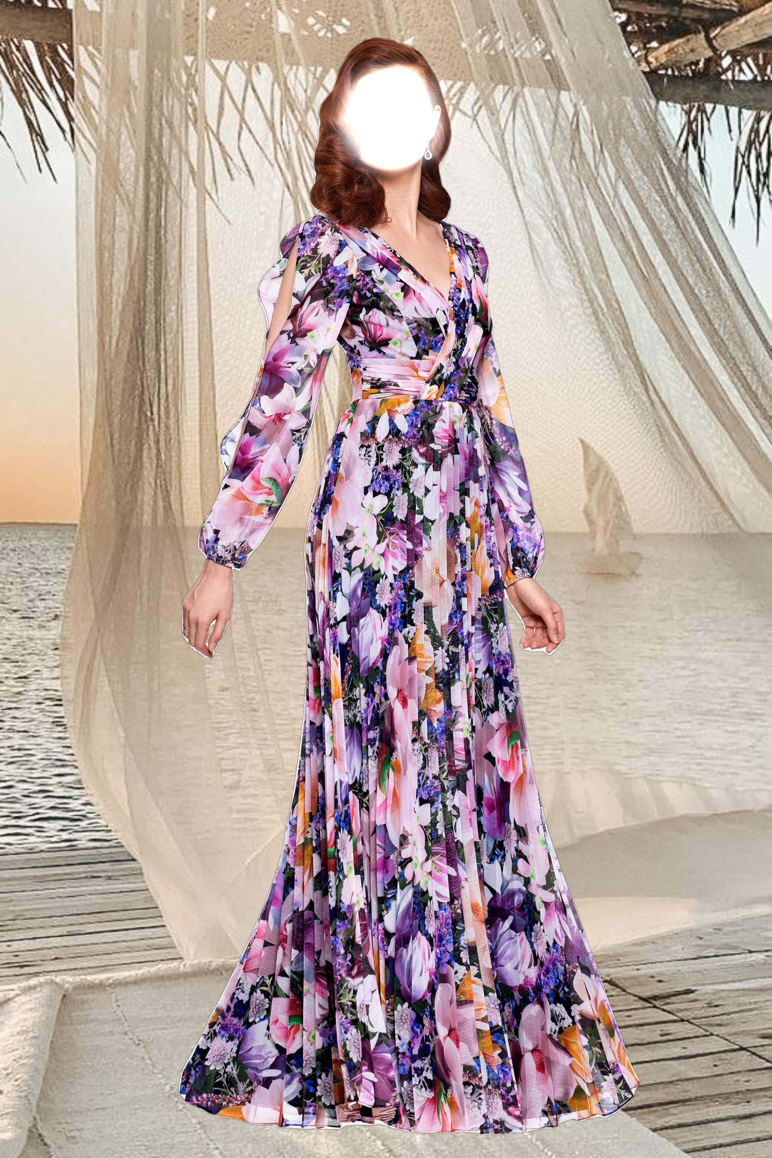This enchanting gown features a wrap-style bodice and billowy long sleeves, creating a timeless silhouette. Perfect for garden parties or formal occasions, its flowing skirt enhances every movement with grace and charm.