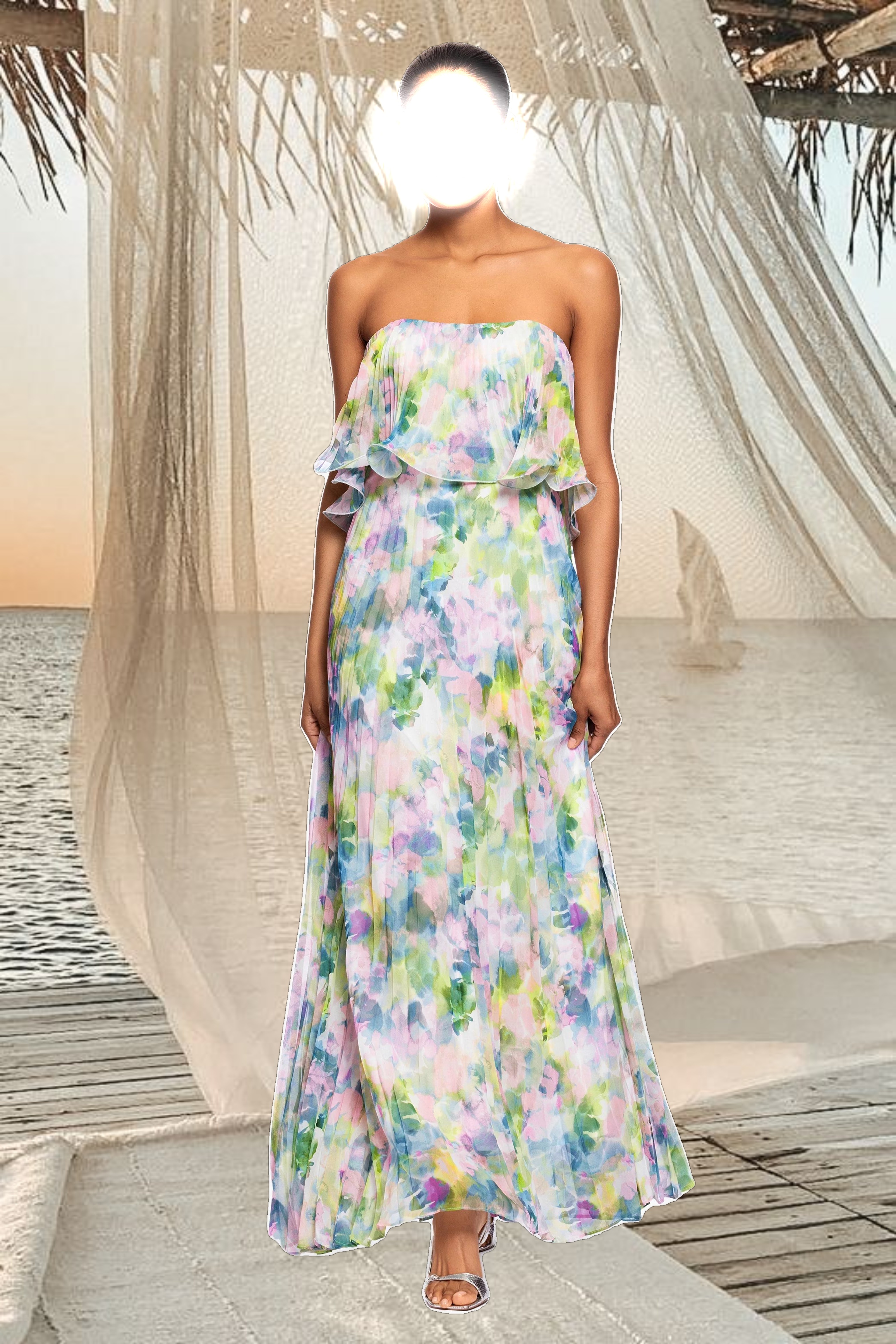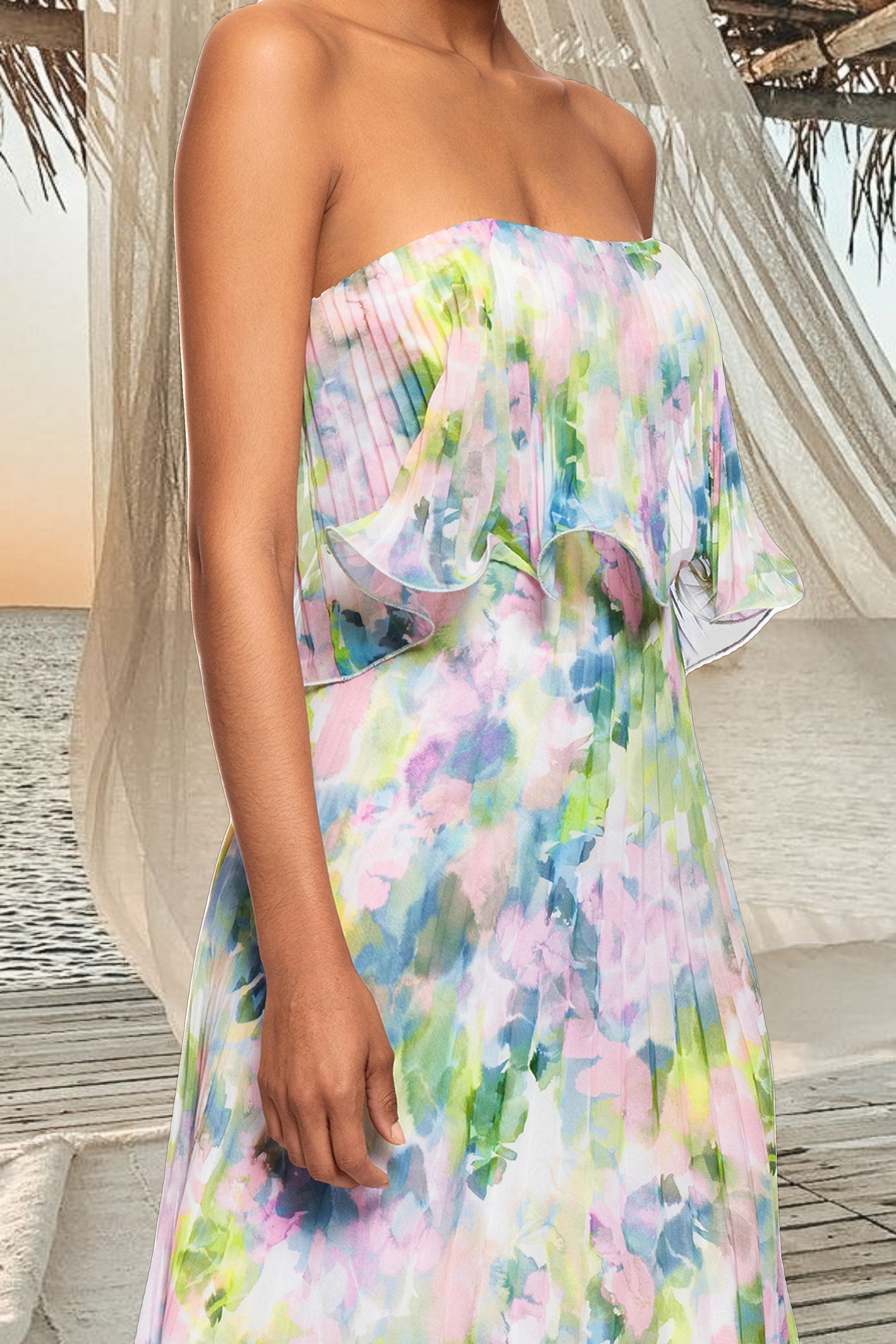 "Enid" Strapless Print Chiffon Pleated Floor Length Dress