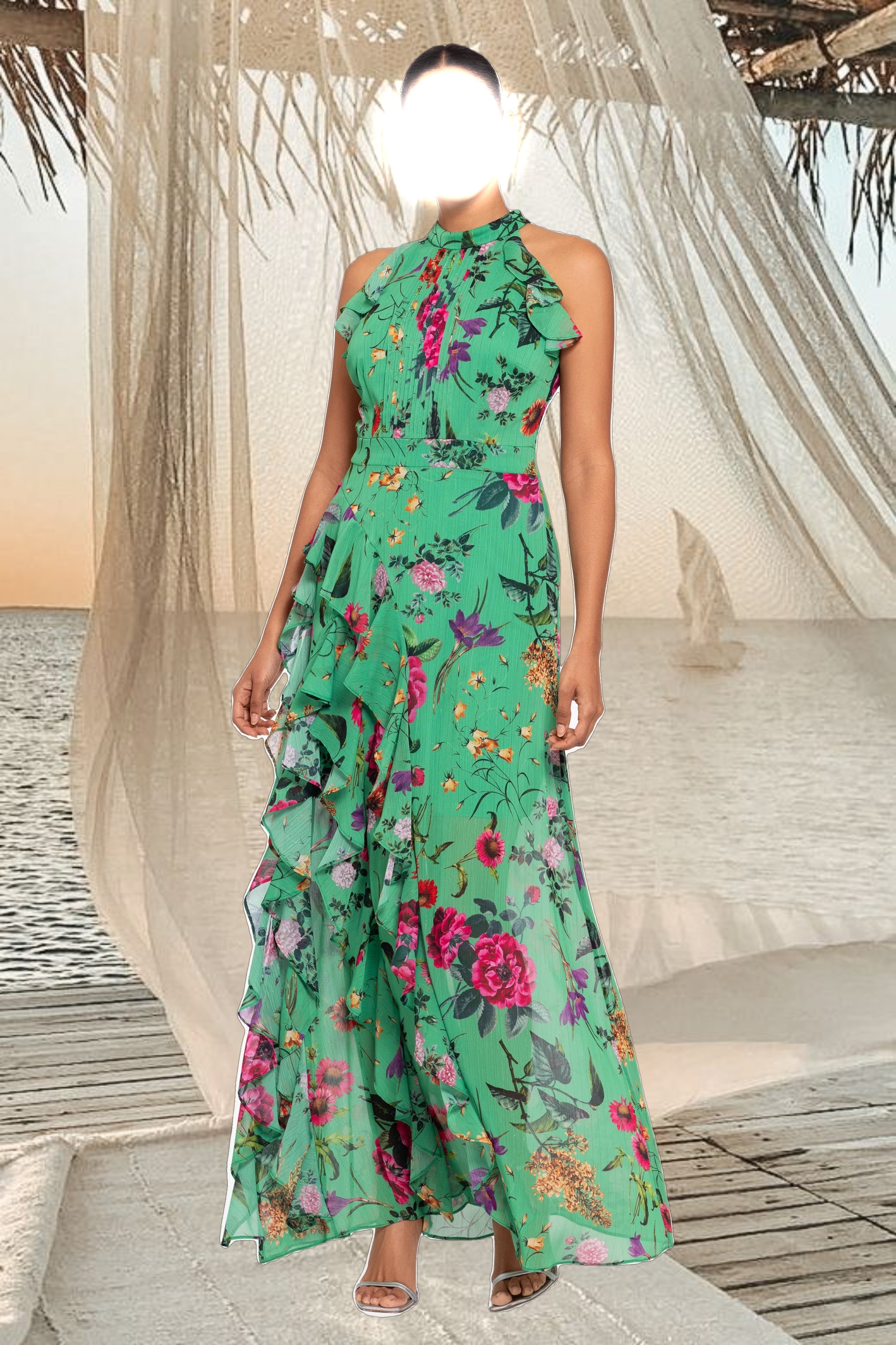 "Joseline" Chiffon Print Floor Length Ruffle Dress
