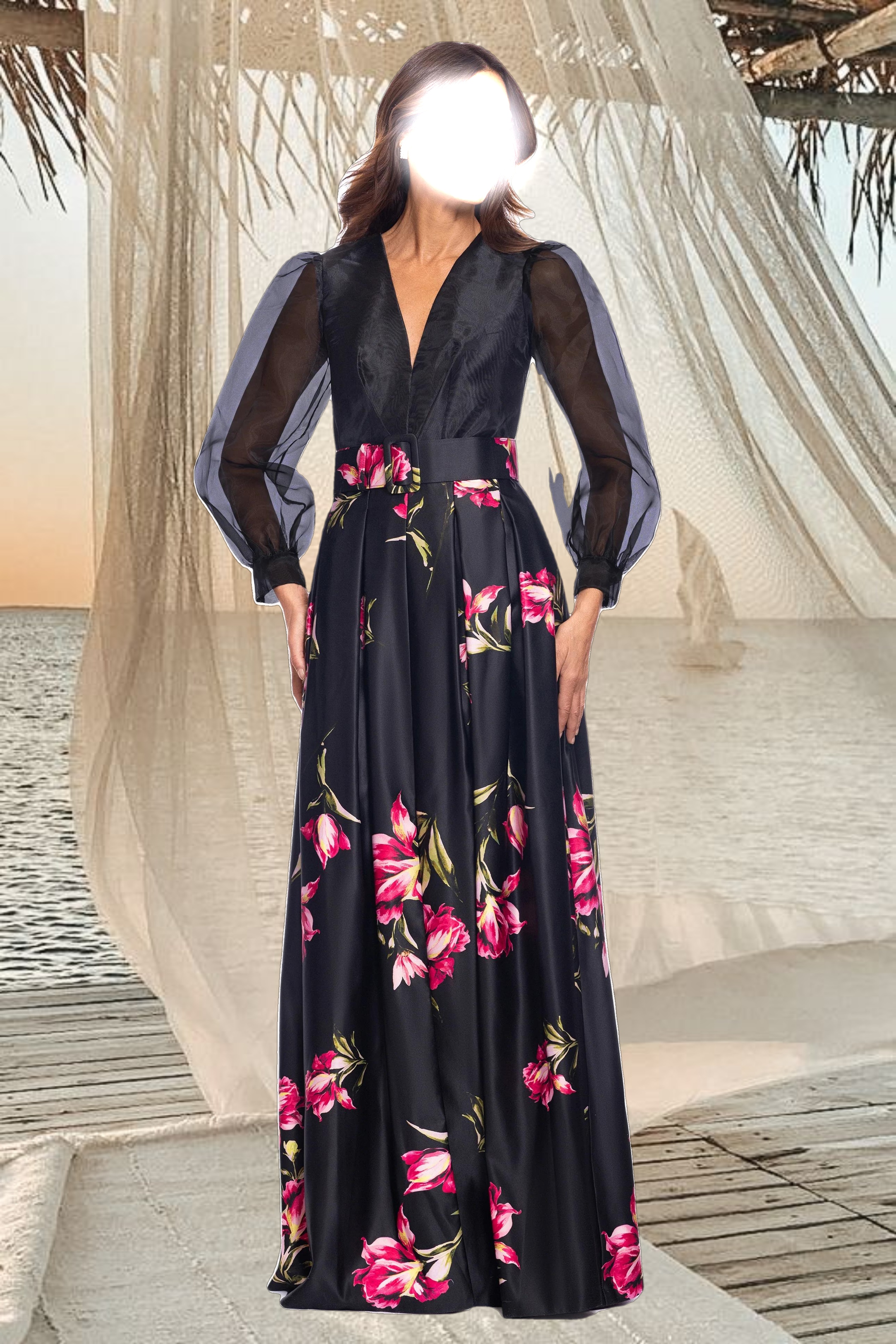 "Coraline" Long Sleeve Satin Print Floor Length Gown