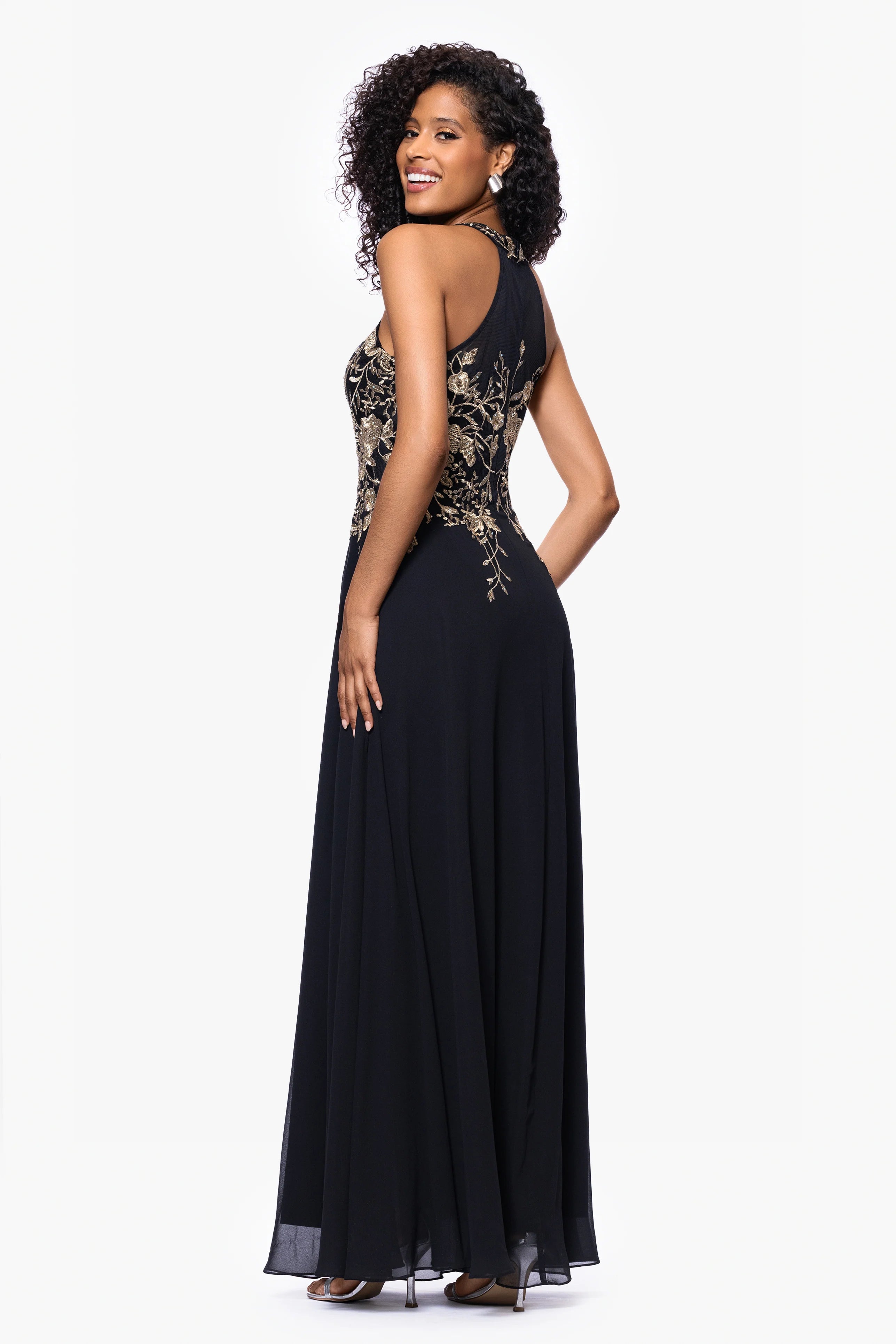 A embellished gold bodice beautifully contrasts with the full tulle skirt on this ballgown, mixing modern sensibilities with timeless elegance.