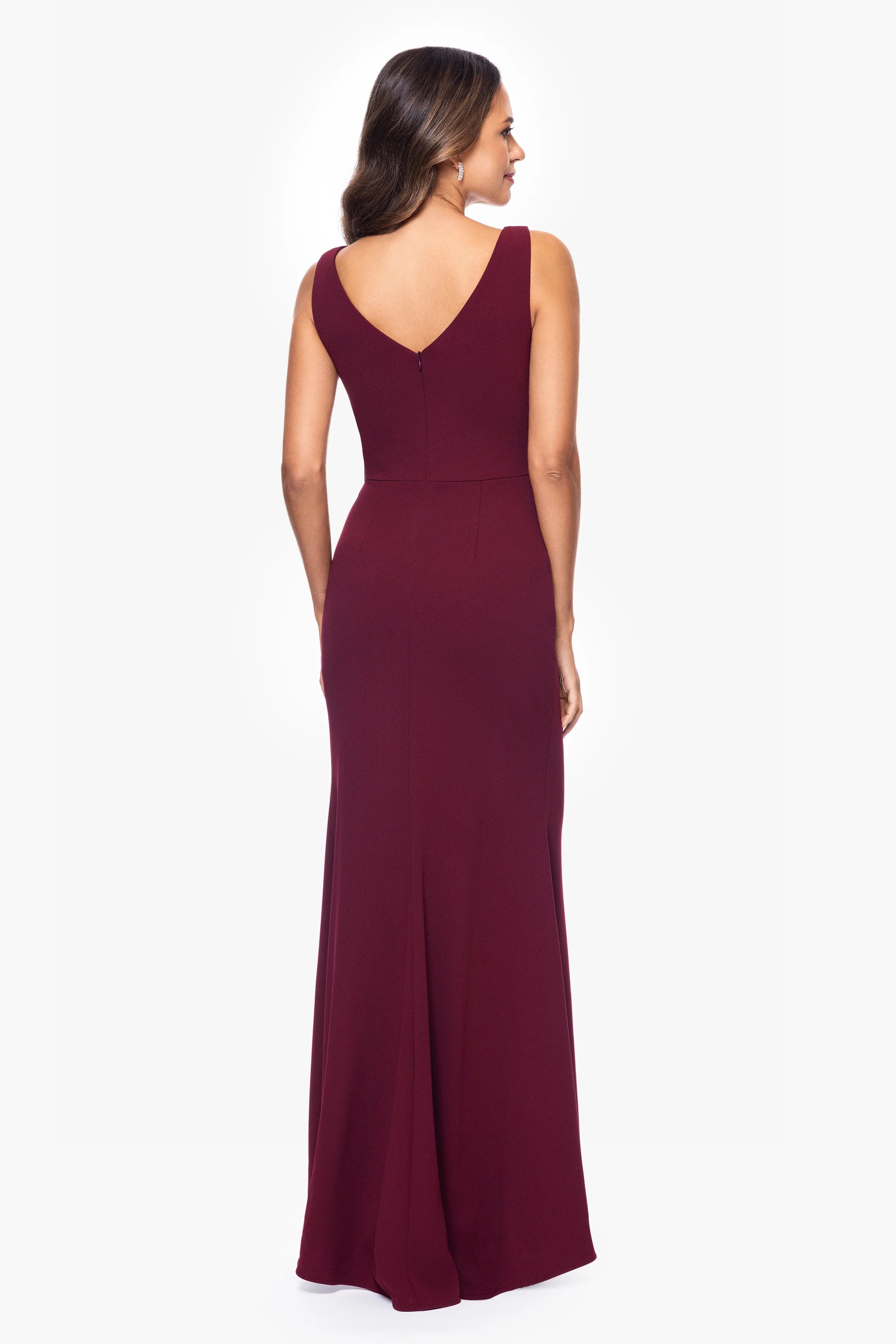 Take a bold step into the unknown with the "Christine" Scuba Crepe Ruffled Bow Gown. Made with durable scuba crepe material, fully lined for comfort and confidence. Hidden back zipper for a seamless fit. Features a boat neck, ruffled bow, and daring slit. Reach for new heights and shine in this dress!