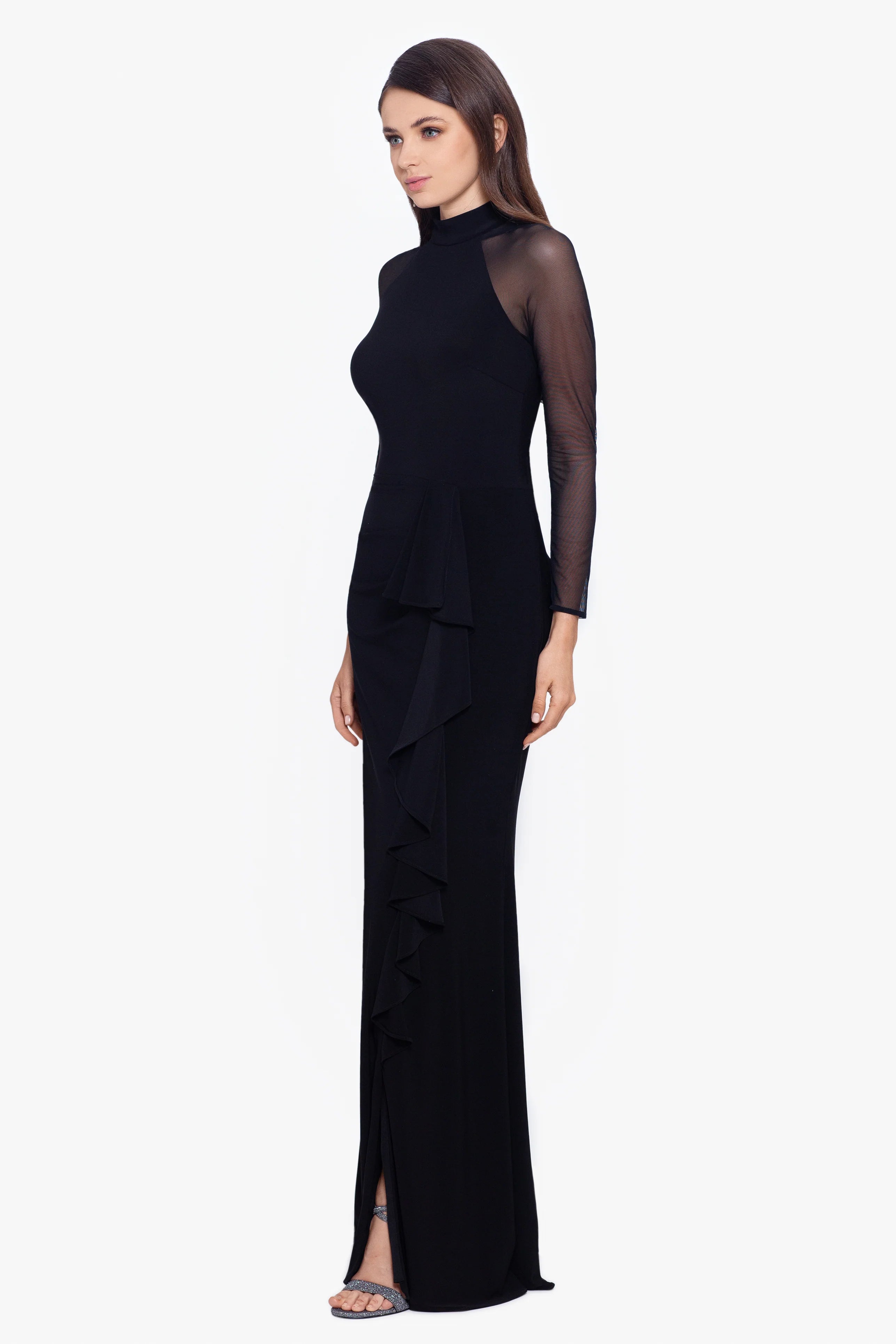 Unleash your daring side in the Petite "Valerie" Long Mock Neck Mesh Long Sleeve Dress! Made of comfortable jersey material with a fully lined body, this dress effortlessly combines elegance and edge. The hidden back zipper and mock neck add a touch of mystery while the mesh sleeves add a bold statement. Command the room with confidence and style.